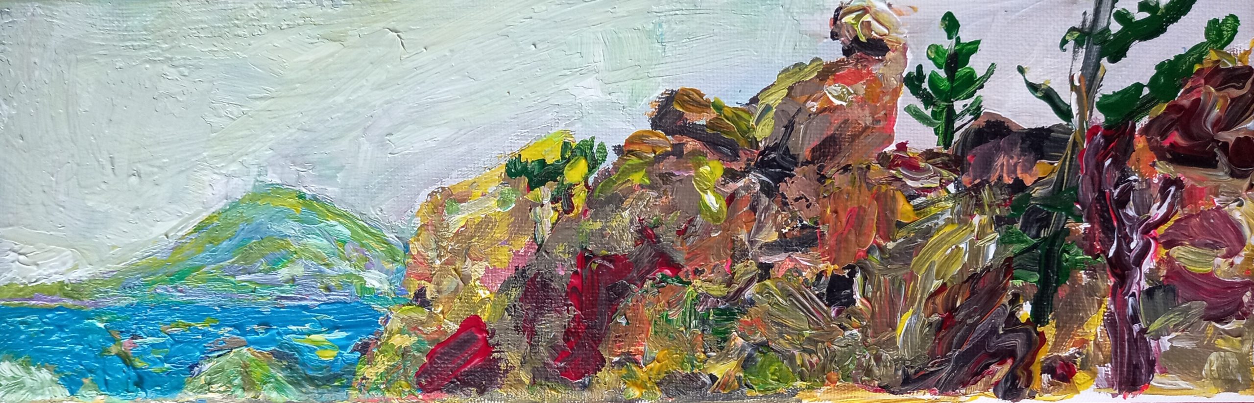 An expressive piece painted on Magnetic Island, about the beautiful energy in the landscape – rock boulders, precariously balanced and placed there by volcaneous many many years ago. Growing alongside are hoop pines and that tropical feeling of beautiful blue water sparkling nearby.