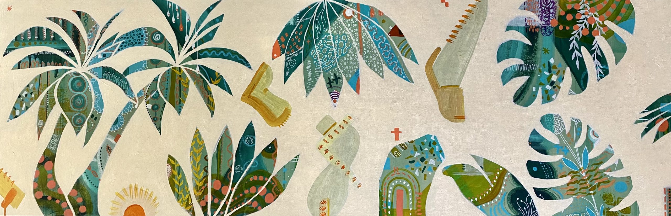 Tropical Conversation by Wendy Peters – original mixed media on canvas. Tropical Conversation was born out of a love of the Sunshine Coast Beaches, the incredible colours that are present, reminiscent of the colour of the ocean and sky and thoughts of holidays. The detail in this abstract is full of layers and mark making, intricate and delightful and would look fab in a lounge or bedroom in a traditional or contemporary setting as a nice focal point. Unframed. Signed on the front.