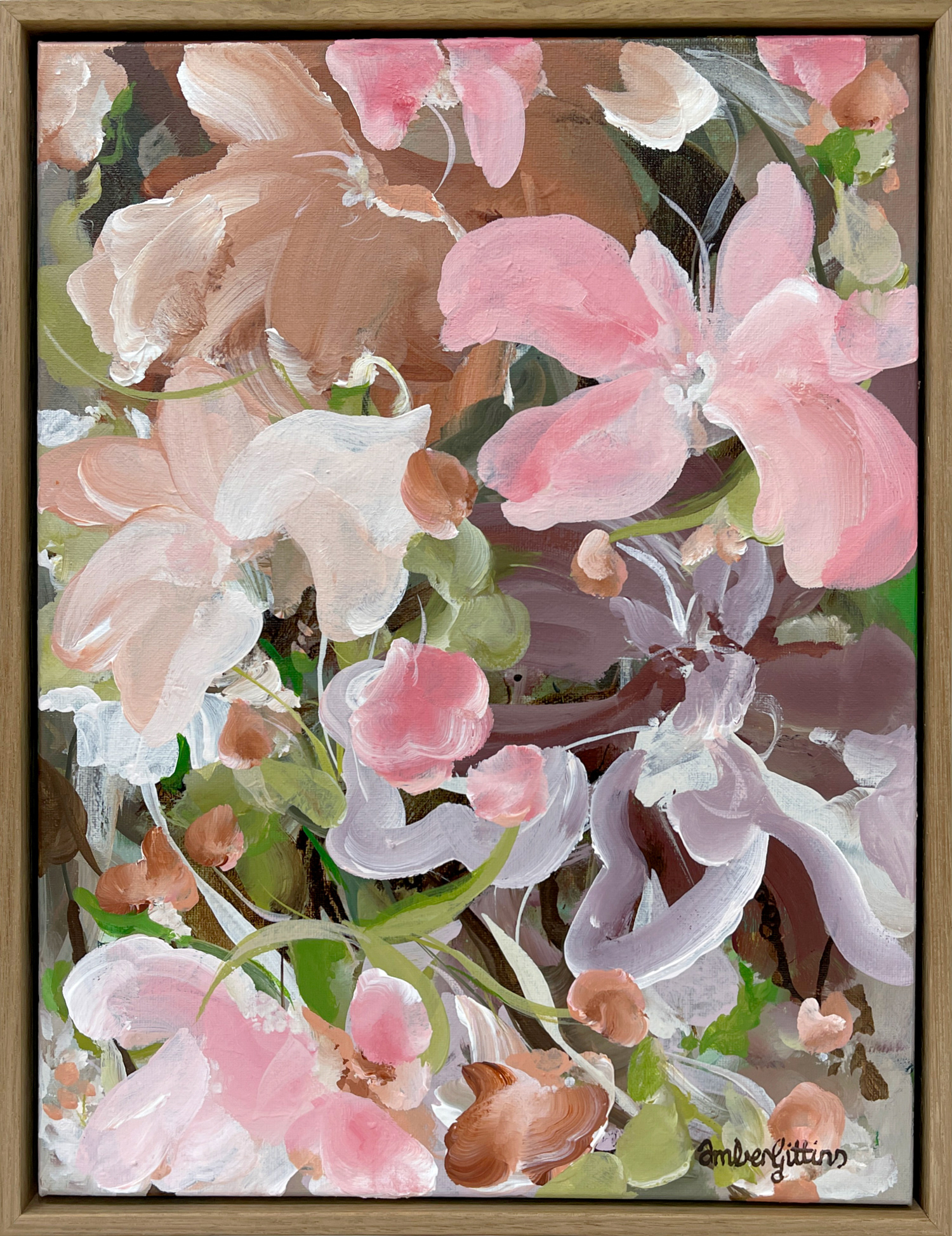 Bring nature into your home with this stunning abstract floral original painting. Inspired by the tranquil moments wandering around in a tropical flower garden and feeling the coolness of the tropical rainforest. Elevate your room with a modern botanical style painting in calming warm browns and soft pastel pinks that will never go out of style.
