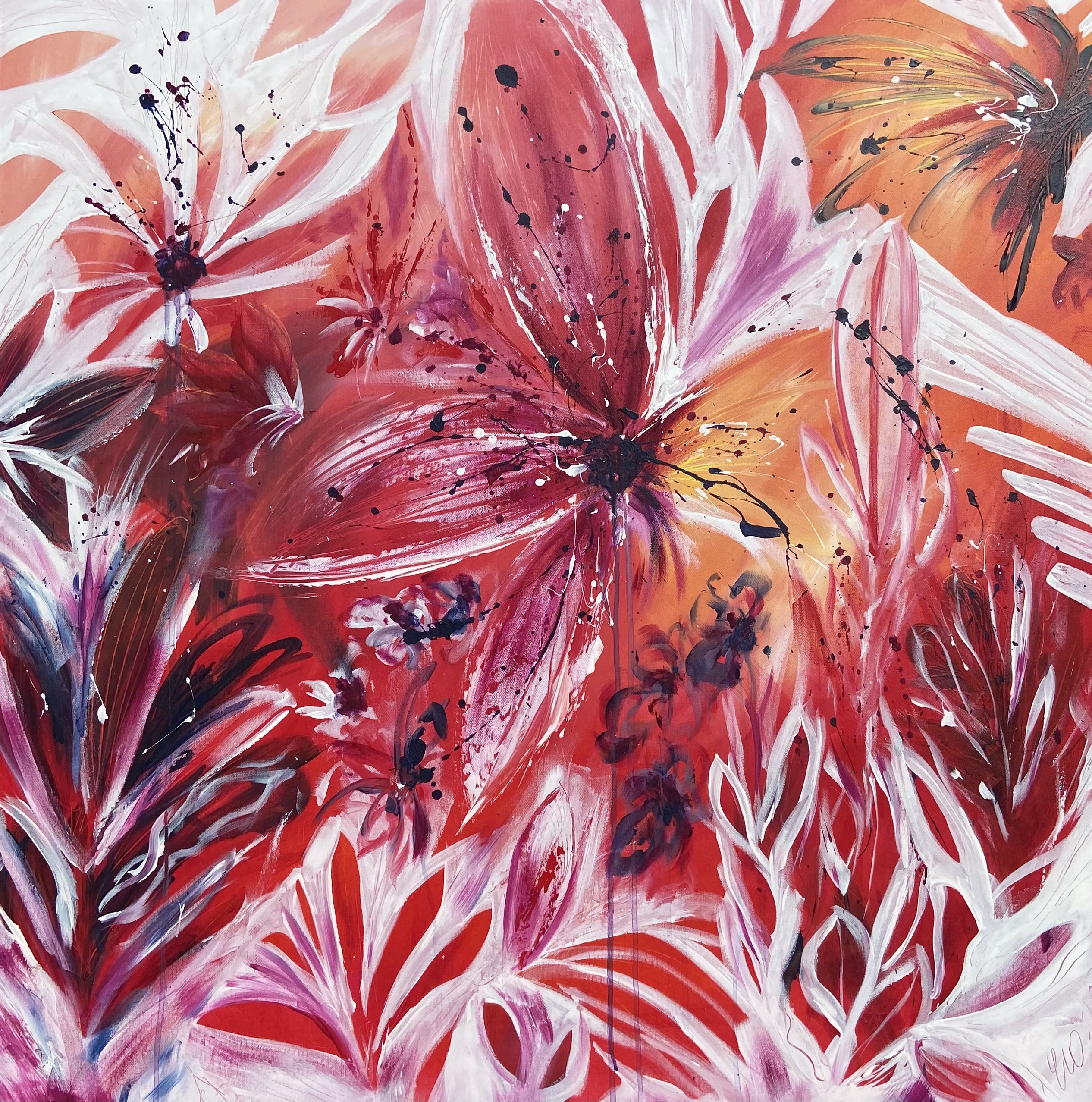 Tropical Haven by Carrie Welsh is a beautiful abstract botanical piece that evokes a warm peaceful feel. 101.6 x 101.6 x 5 cm. Acrylic on canvas, ready to hang. Some images show what this painting will look like framed. Frames not included.