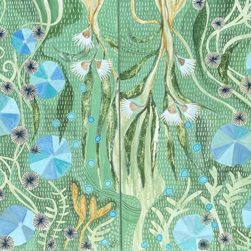 This artwork is created using a combination of textured paste, acrylic paint, beach sand from Northen Beaches in Sydney.