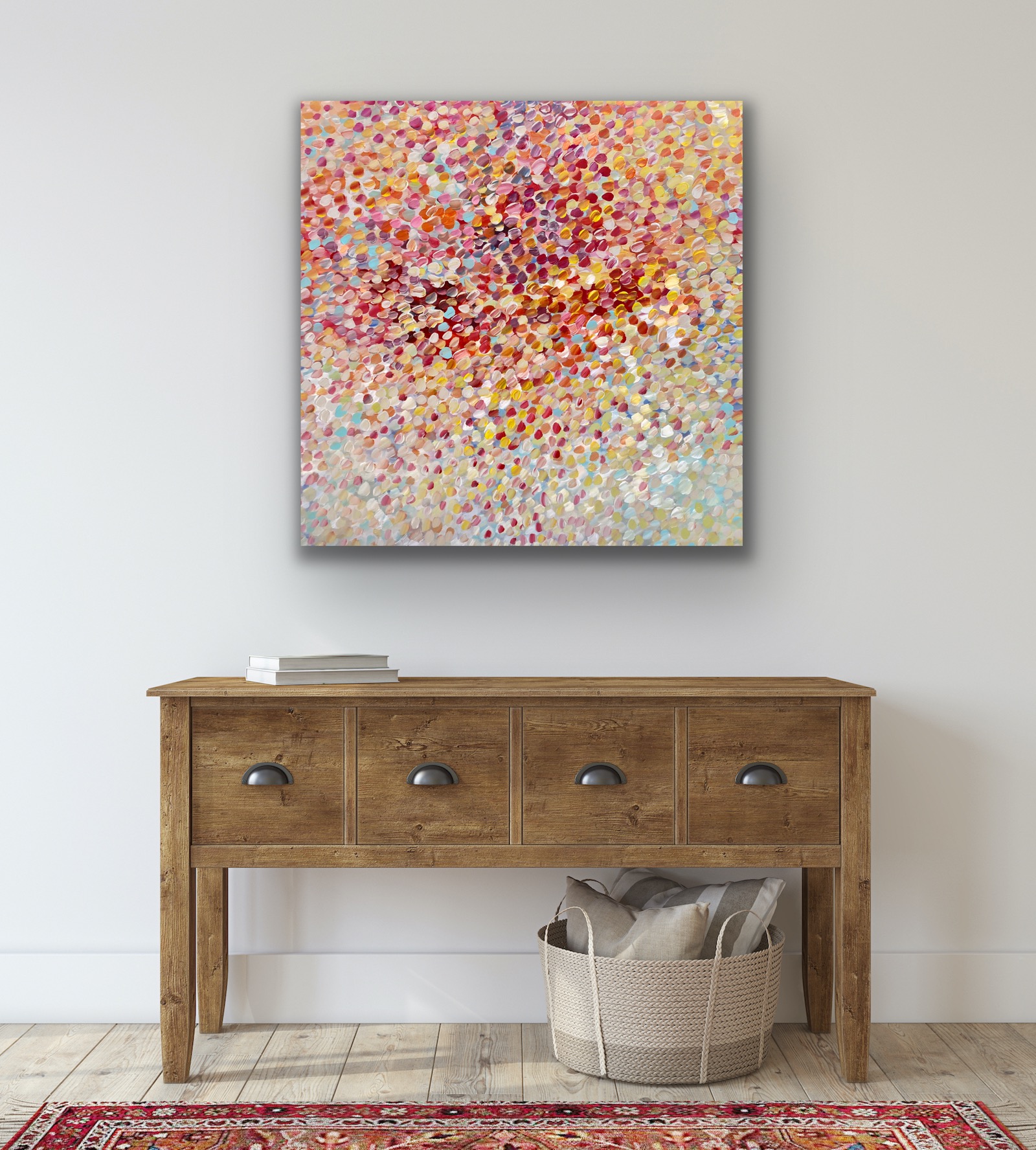 Truly Yours a painting with warm colours of the petals flying in the wind creating this beautiful carpet of petals in the landscape with lots of layers of paint. Beautiful flickering petals dancing over the land shining shining like stars. Petals weeping onto the landscape creating this veil of colours covering the landscape . A composition of colours and rhythms of petals dancing like musical notes . A very peaceful and tranquil painting with so much depth.The painting is signed and dated 2021 at the back and comes with a certificate of Authenticity.