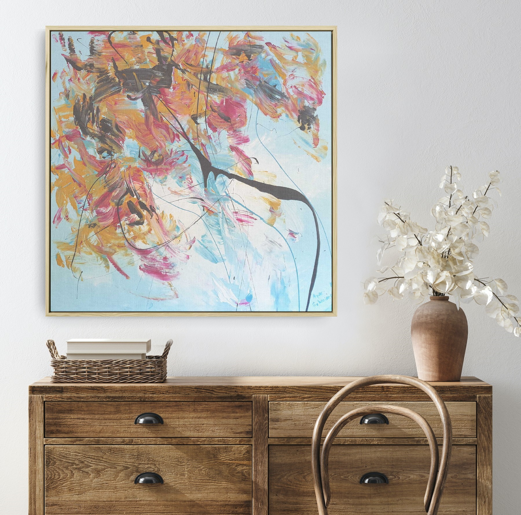 The painting does’t come with the external frame. The images attached are representations of what it could look like after being framed. No hanging wire.
