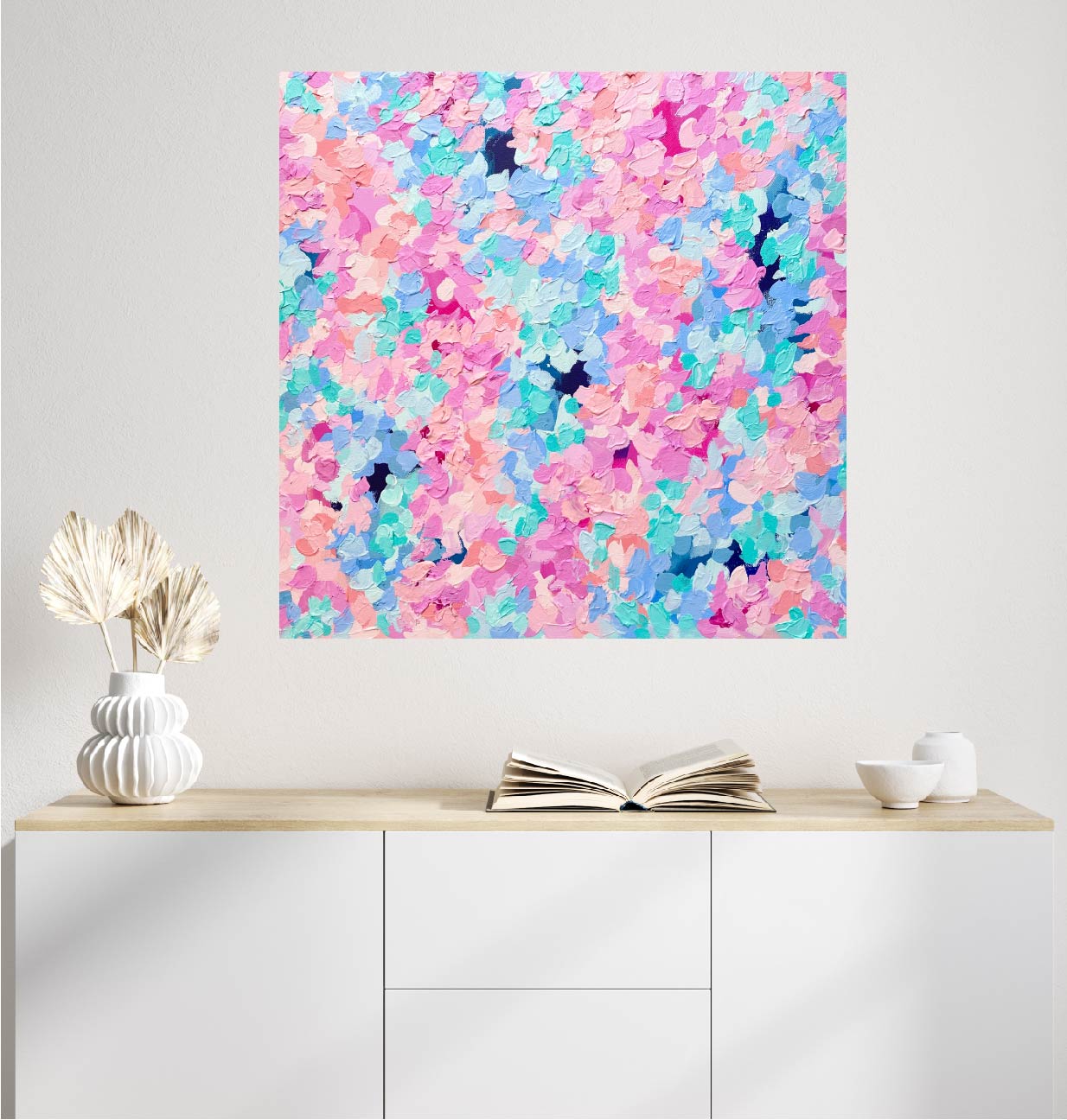Acrylic on hand stretched canvas framed in a white floating frame.