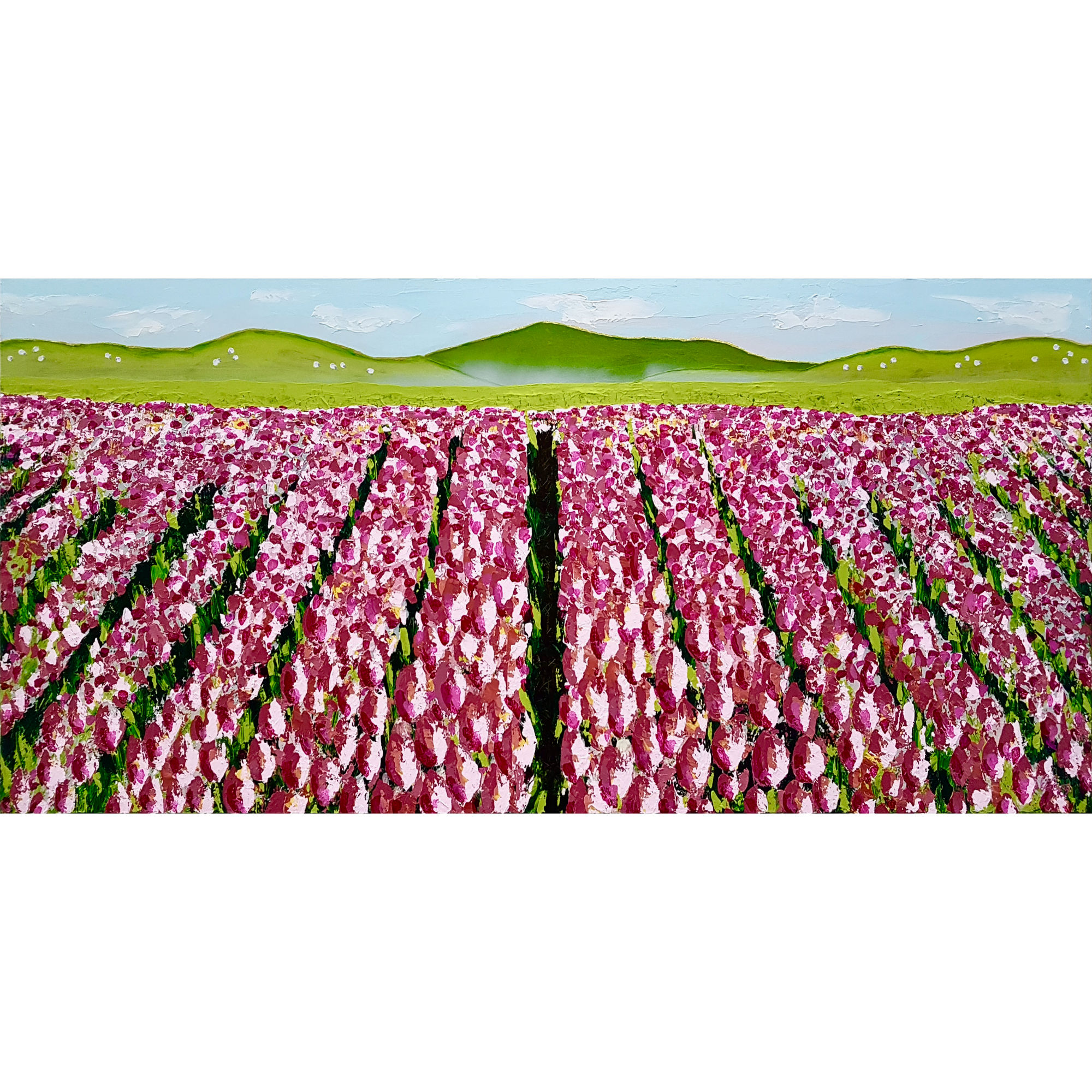 Hand painted on stretched canvas impasto style thick with layers of texture early morning at the tulip fields just before the sun comes up.