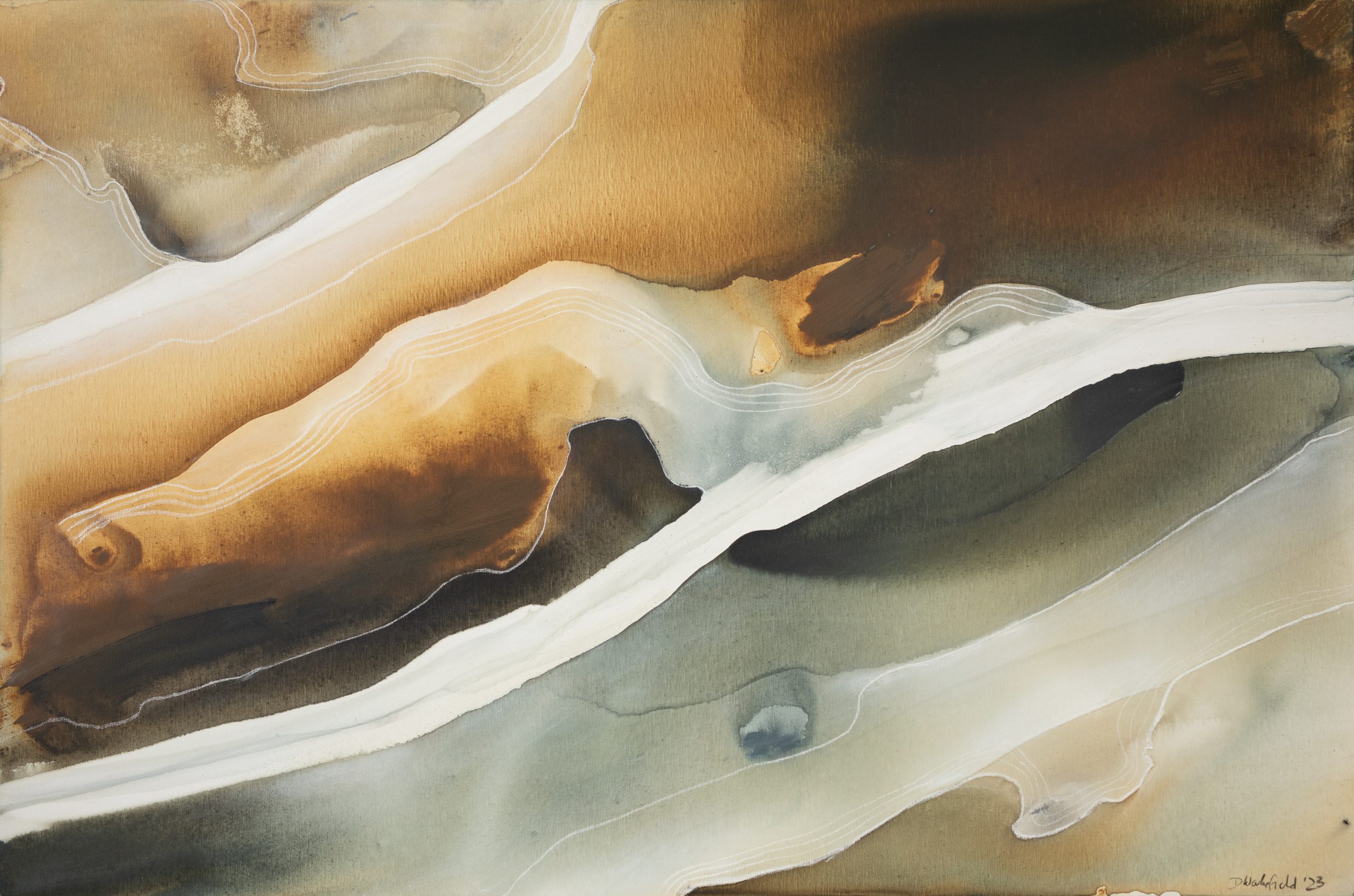 Tundra 2 by Dinah Wakefield is inspired by the light, the colours and the natural beauty of the Noosa region of Australia. “What I love most about Noosa is the interplay of light. From the oceans to the clouds, to the river estuaries and the hinterland, this canvas unfolds before me every day and finds expression in my paintings”.
