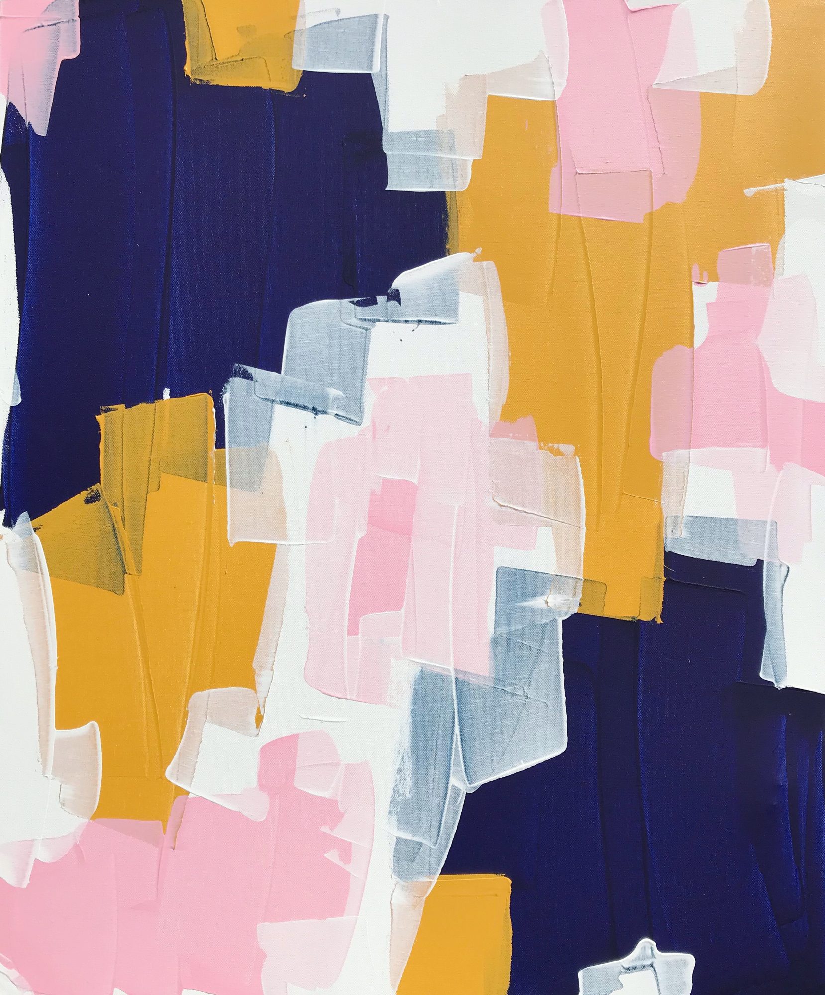 Original artwork in dark blue, turmeric, pale pink & white. When creating these artworks I am completely guided by the paint when it’s scraped across the canvas.