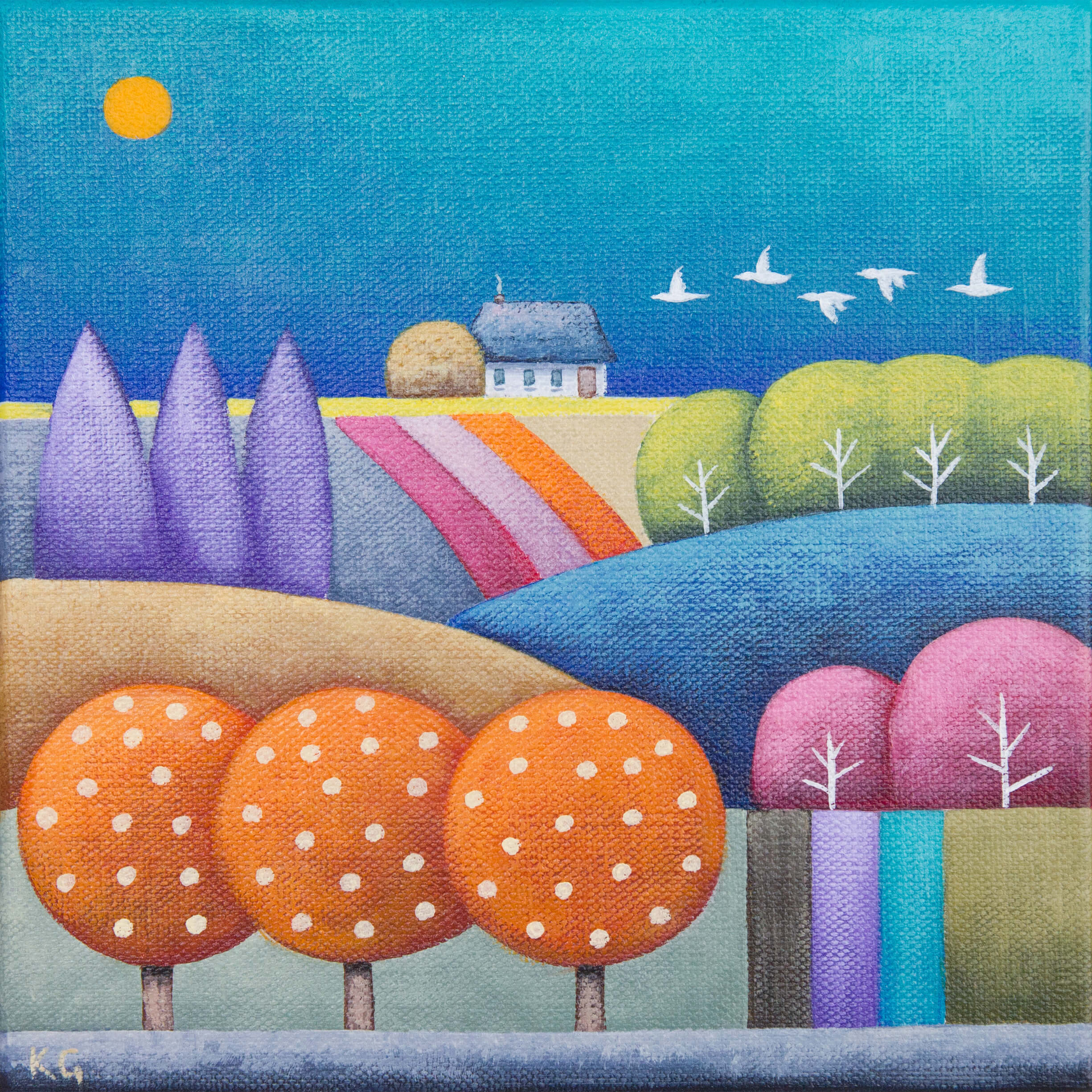 This small, square landscape scene depicts a turquoise blue sky with interspersed with green, purple, pink, and orange polka-dot trees. A house sits on the horizon with rolling hills below. Painted in a charming, naive style. This piece would make a colourful addition to an art collection and is perfect for those smaller spaces. Wire on the back ready to hang, sides painted in a continuance of the composition so no need to frame, but would look great in a natural wood floating frame.