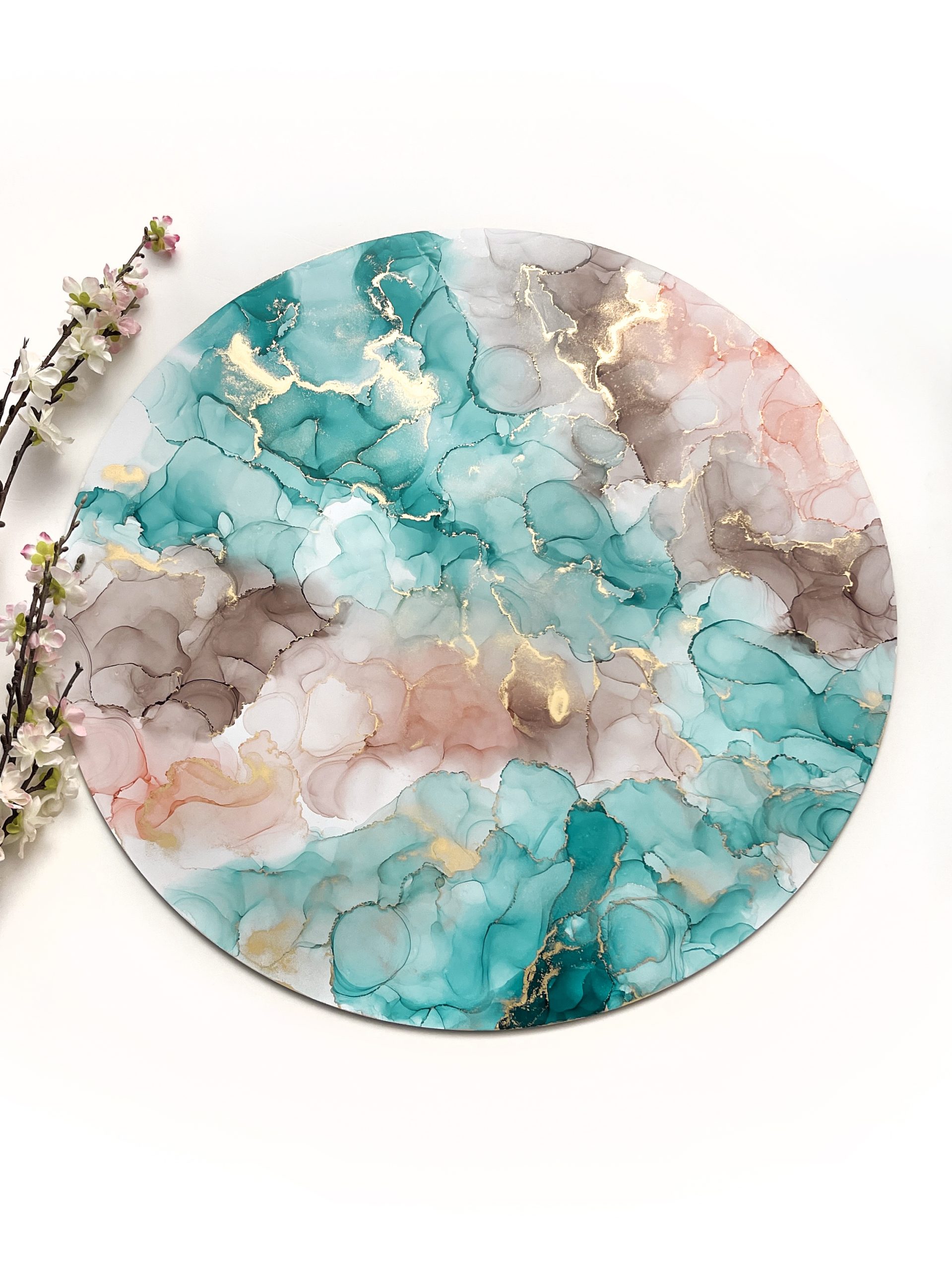 Swirling teal with touches of champagne and peach