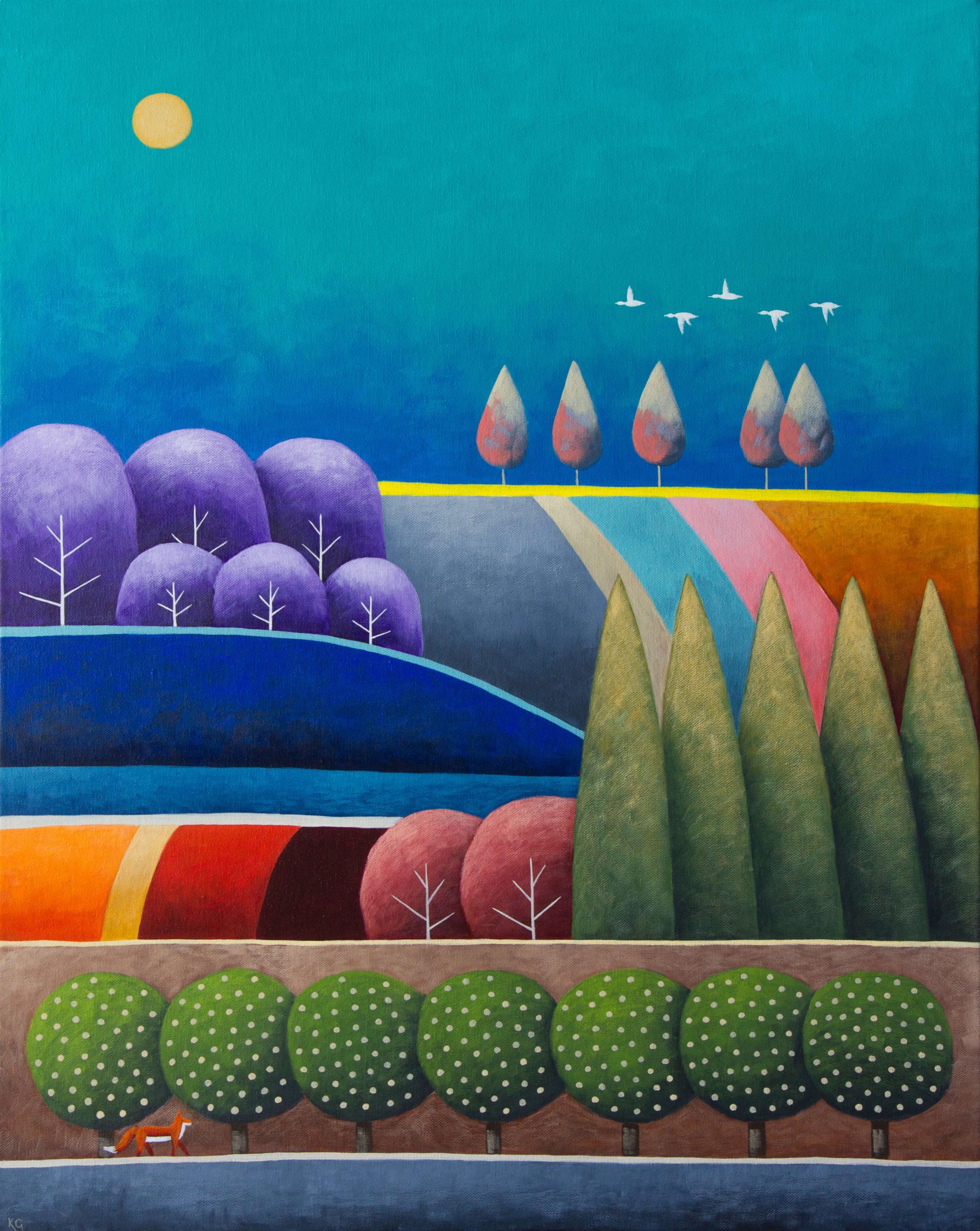 Turquoise Frankie by Kate Graham. This daytime landscape features a soaring turquoise sky with birds and a patchwork of fields interwoven with trees below, including a Frankie the Fox amongst the fruit trees. It is an almost surreal rural scene that celebrates colour and composition. Painted in a naive style to bring a sense of charm and delight, painted with dry-brush effect to give it a textured feel. This piece is part of the ‘Patchwork’ series where colours are woven together in a patchwork of harmony and sometimes disharmony. The flattened perspective gives the composition a naive and whimsical feel. The painting invites the viewer to see landscapes from another imaginative point of view. This piece would fit anywhere in a home or office, bedroom or living room, and is a great way to either start your art collection, or add a splash of colour to your decor.Â