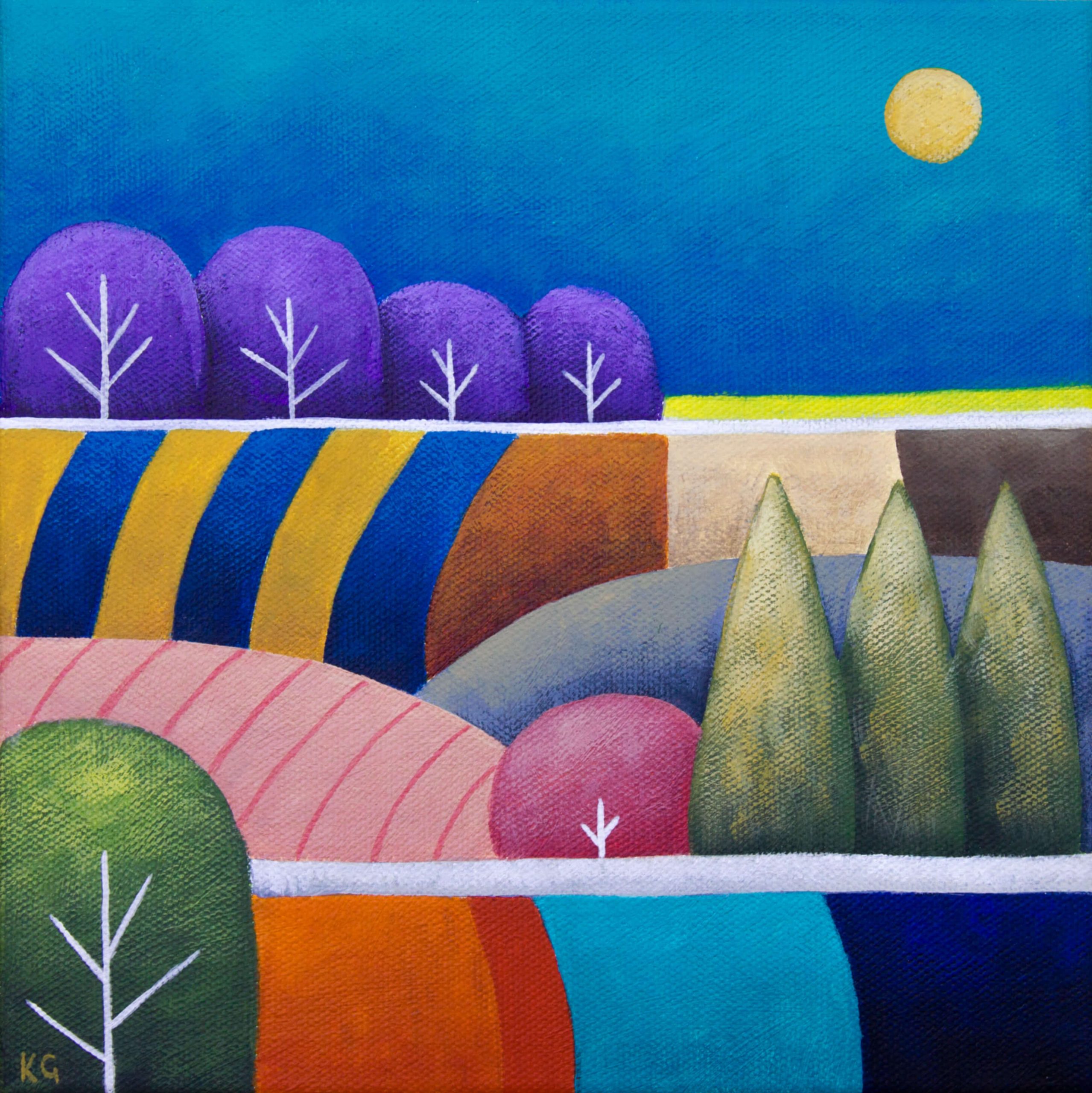 Turquoise Petite No 1 by Kate Graham. This small daytime landscape features a soaring turquoise sky and a patchwork of fields interwoven with trees below. It is an almost surreal rural scene that celebrates colour and composition. Painted in a naive style to bring a sense of charm and delight, painted with dry-brush effect to give it a textured feel. This piece is part of the ‘Patchwork’ series where colours are woven together in a patchwork of harmony and sometimes disharmony. The flattened perspective gives the composition a naive and whimsical feel. The painting invites the viewer to see landscapes from another imaginative point of view. This piece would fit anywhere in a home or office, bedroom or living room, and is a great way to either start your art collection, or add a little touch of colour to your decor in limited spaces.