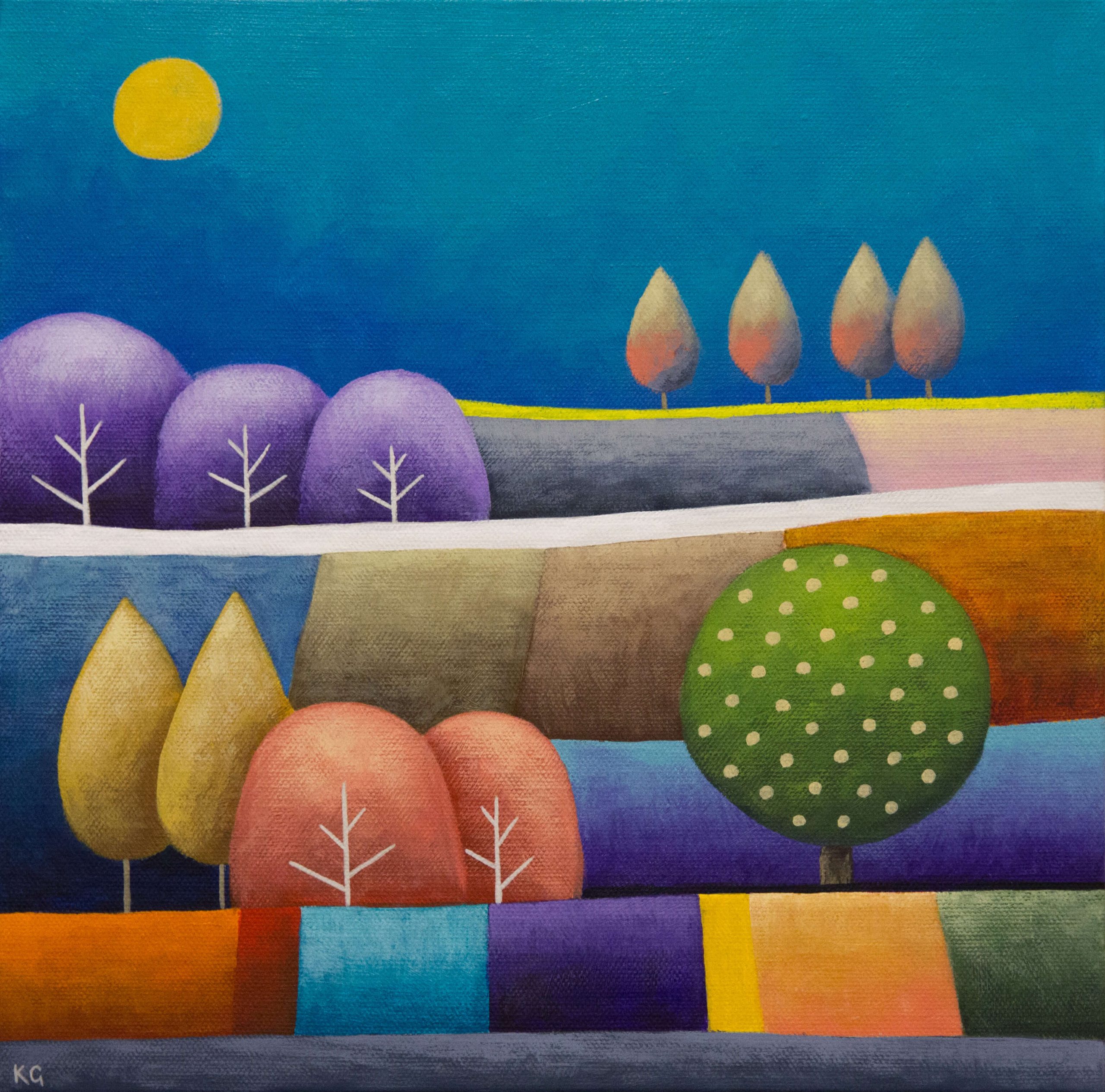Turquoise Patchwork – Square by Kate Graham. This small, square daytime landscape featuring a soaring turquoise sky and a patchwork of fields interwoven with trees below. It is an almost surreal rural scene that celebrates colour and composition. Painted in a naive style to bring a sense of charm and delight, painted with dry-brush effect to give it a textured feel. This piece is part of the ‘Patchwork’ series where colours are woven together in a patchwork of harmony and sometimes disharmony. The flattened perspective gives the composition a naive and whimsical feel. The painting invites the viewer to see landscapes from another imaginative point of view. This piece would fit anywhere in a home or office, bedroom or living room, and is a great way to either start your art collection, or add a little touch of colour to your decor in limited spaces.