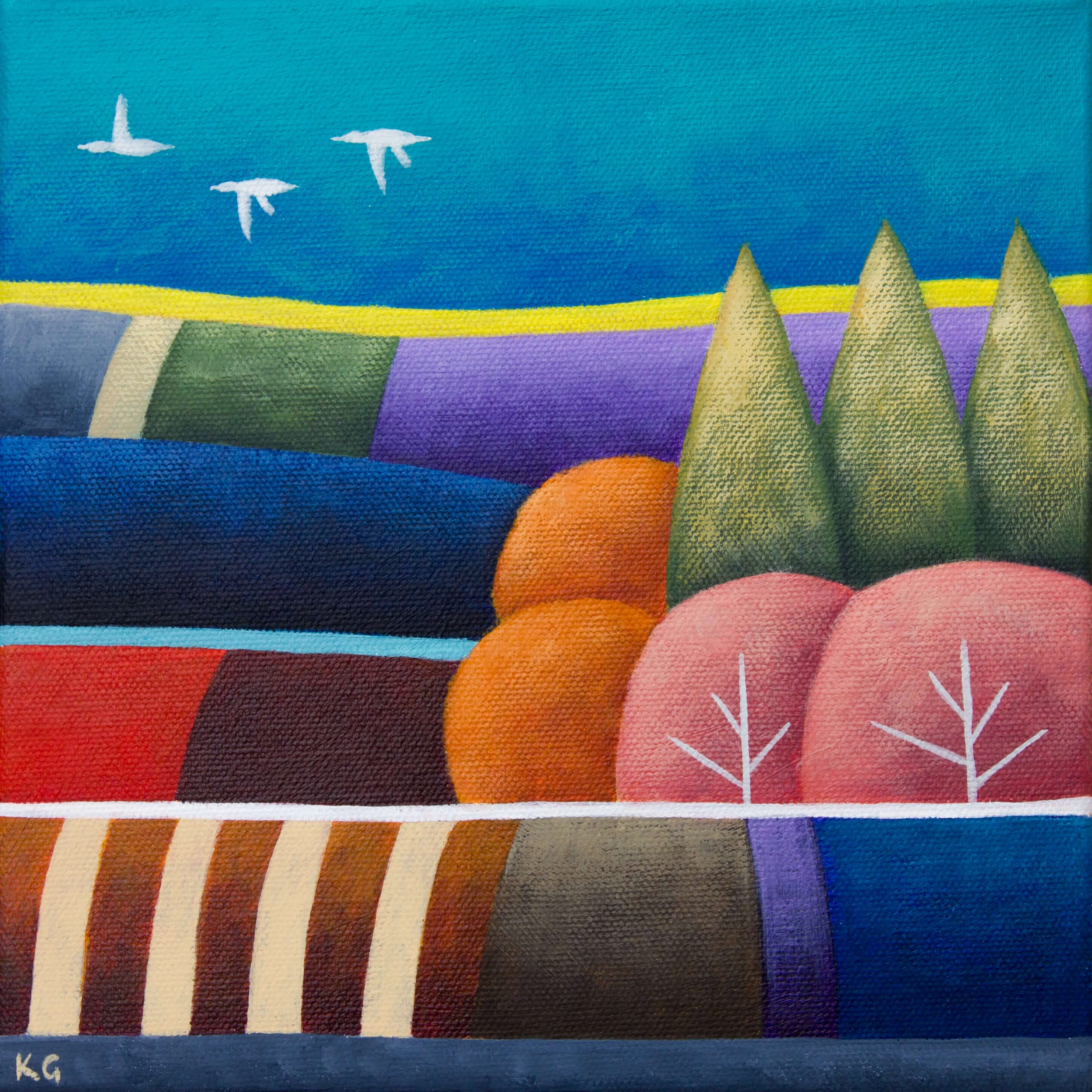 Turquoise Petite No 2 by Kate Graham. This small daytime landscape features a soaring turquoise sky and a patchwork of fields interwoven with trees below. It is an almost surreal rural scene that celebrates colour and composition. Painted in a naive style to bring a sense of charm and delight, painted with dry-brush effect to give it a textured feel. This piece is part of the ‘Patchwork’ series where colours are woven together in a patchwork of harmony and sometimes disharmony. The flattened perspective gives the composition a naive and whimsical feel. The painting invites the viewer to see landscapes from another imaginative point of view. This piece would fit anywhere in a home or office, bedroom or living room, and is a great way to either start your art collection, or add a little touch of colour to your decor in limited spaces.