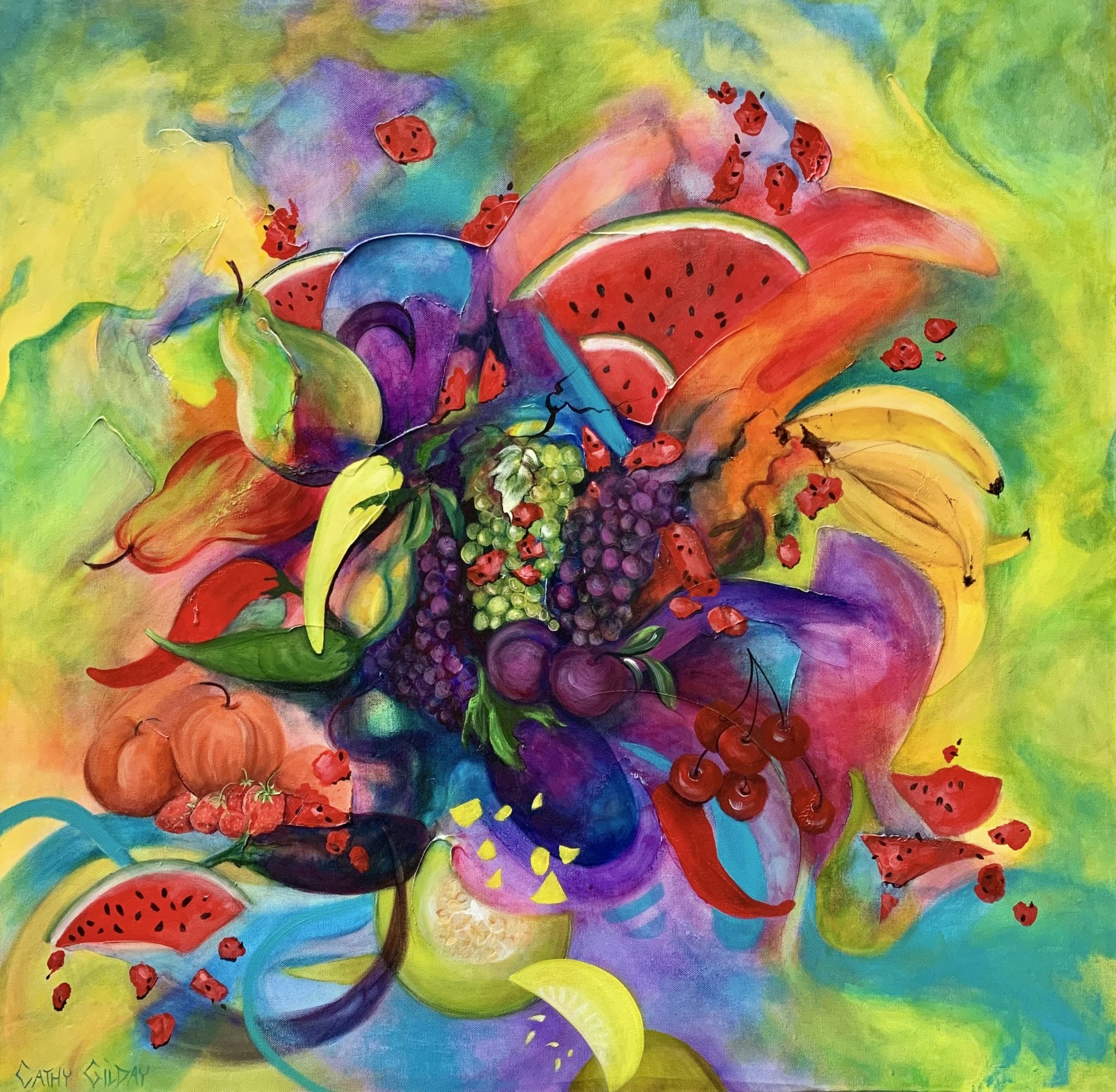 Tutti Frutti by Cathy Gilday – Bursting with vibrant colours and full of movement, this is a bit of a twist on the usual fruit still life. I really enjoyed playing with the composition, which was set on a textured abstract background. There are a variety of luscious fruits and a splattering of smashed watermelon to add to the fun. It would be the perfect addition to a kitchen or cafe.