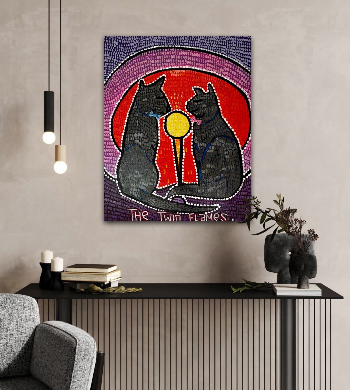 Embrace the mystical connection of soul mates with The Twin Flames—an original acrylic and collage painting by Kim Magee. Featuring two enchanting cats adorned with ribbon bows, this tarot card-inspired artwork symbolizes deep bonds and spiritual harmony. Created on a 40 x 50 cm canvas, this unique piece is a perfect addition to any tarot, cat, or mystical art collection. Signed on the front and ready to hang.
