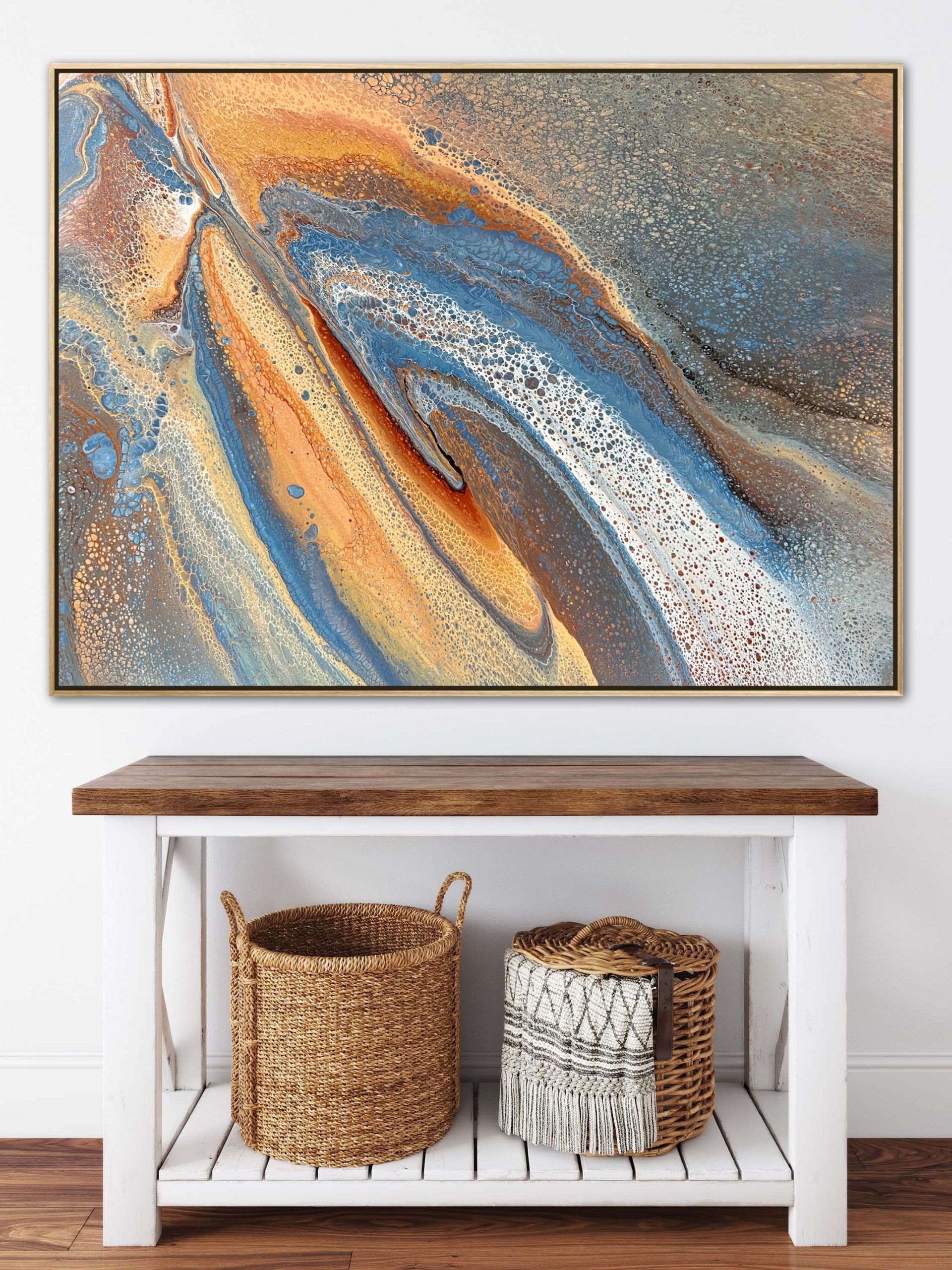 Twisting Earth was created using various techniques combined to allow increased flow, interaction and separation of colours to create interesting patterns where pops of colour can be seen emerging from underneath. This added dimension adds lace and cells to the artwork creating an interesting and one of a kind painting that can never be replicated.