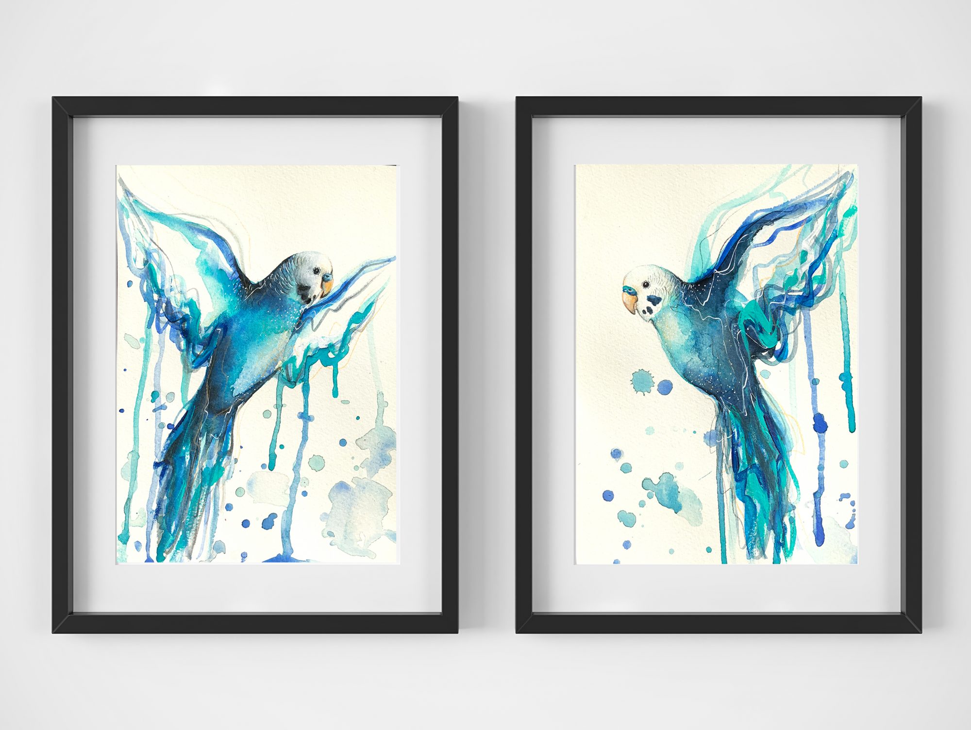 Two Blue Budgies in Flight, by Leni Kae –Â A set of two original artworks of flying blue budgies by Sydney artist Leni Kae. Symbolising joy, fun, and embracing the simple joys in life. A bright and beautiful addition for art collectors, or a unique gift for birdlovers. This artwork is from Leni Kae’s series titled “Animal Spirit”. Blue, light turquoise and soft orange tones.