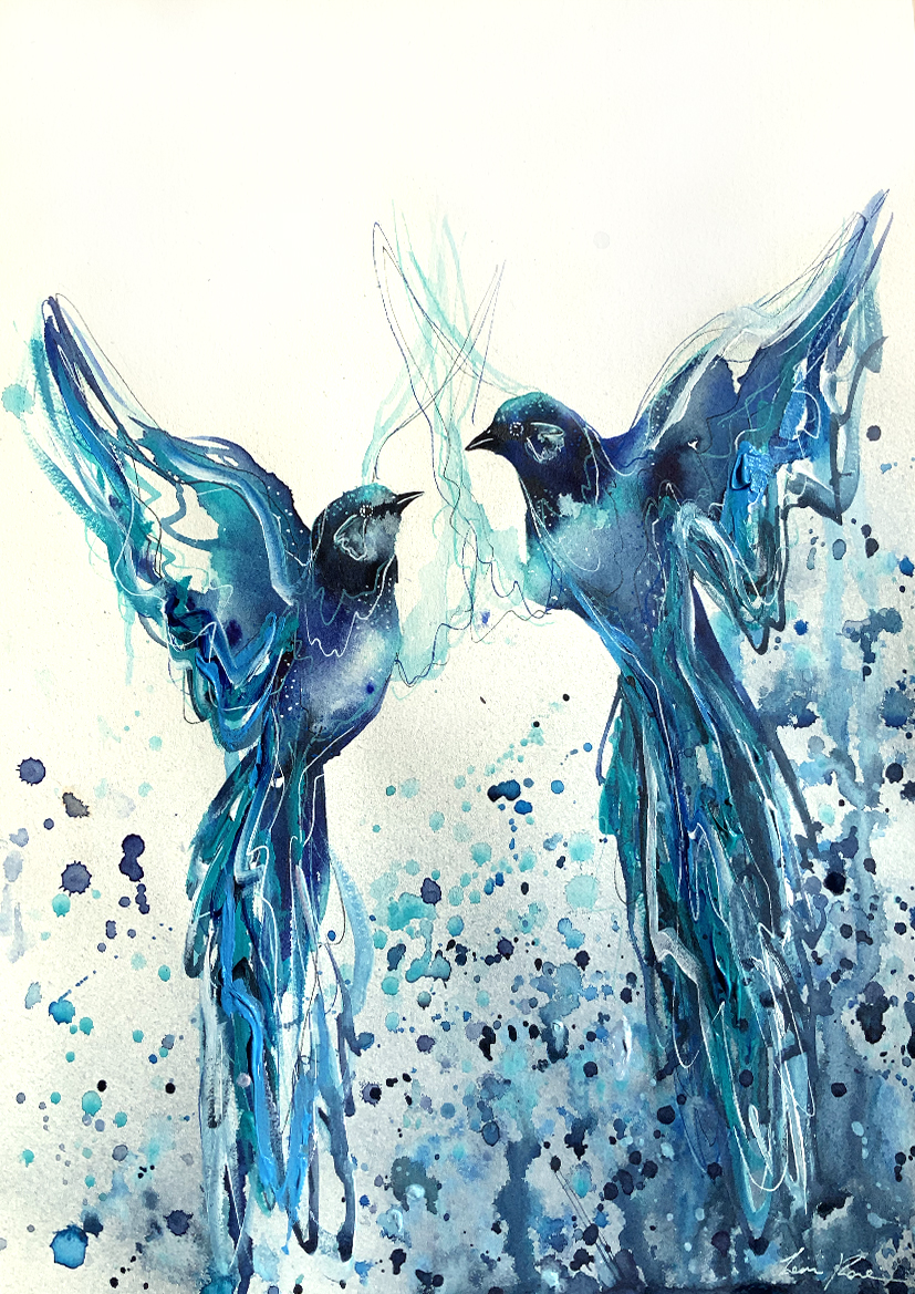 An original watercolour painting of two blue fairy wren flying, by Sydney artist Leni Kae. The painting portrays two fairy wrens flying; a symbol of action, uniting in self love, and freedom. An affordable artwork for investment or unique gift for bird lovers. This artwork is from Leni Kae’s series titled “Animal Spirit”, exploring an emotional connection with animals’ spirit and characteristics. Colours of ultramarine blue, cobalt blue, light turquoise, aqua, indigo, white.
