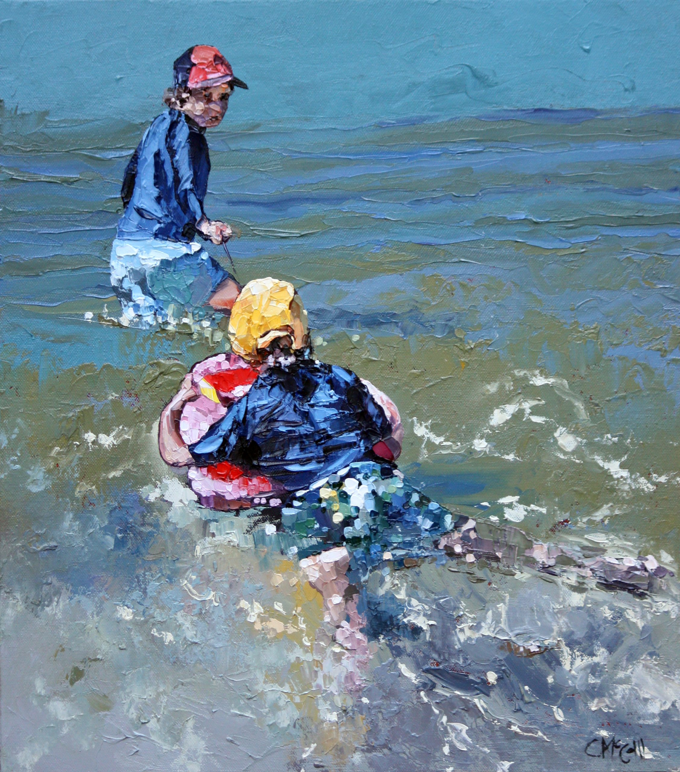Celebrating childhood memories of summers spent at the beach, this painting is completed with a palette knife to provide bold colour, texture and movement.