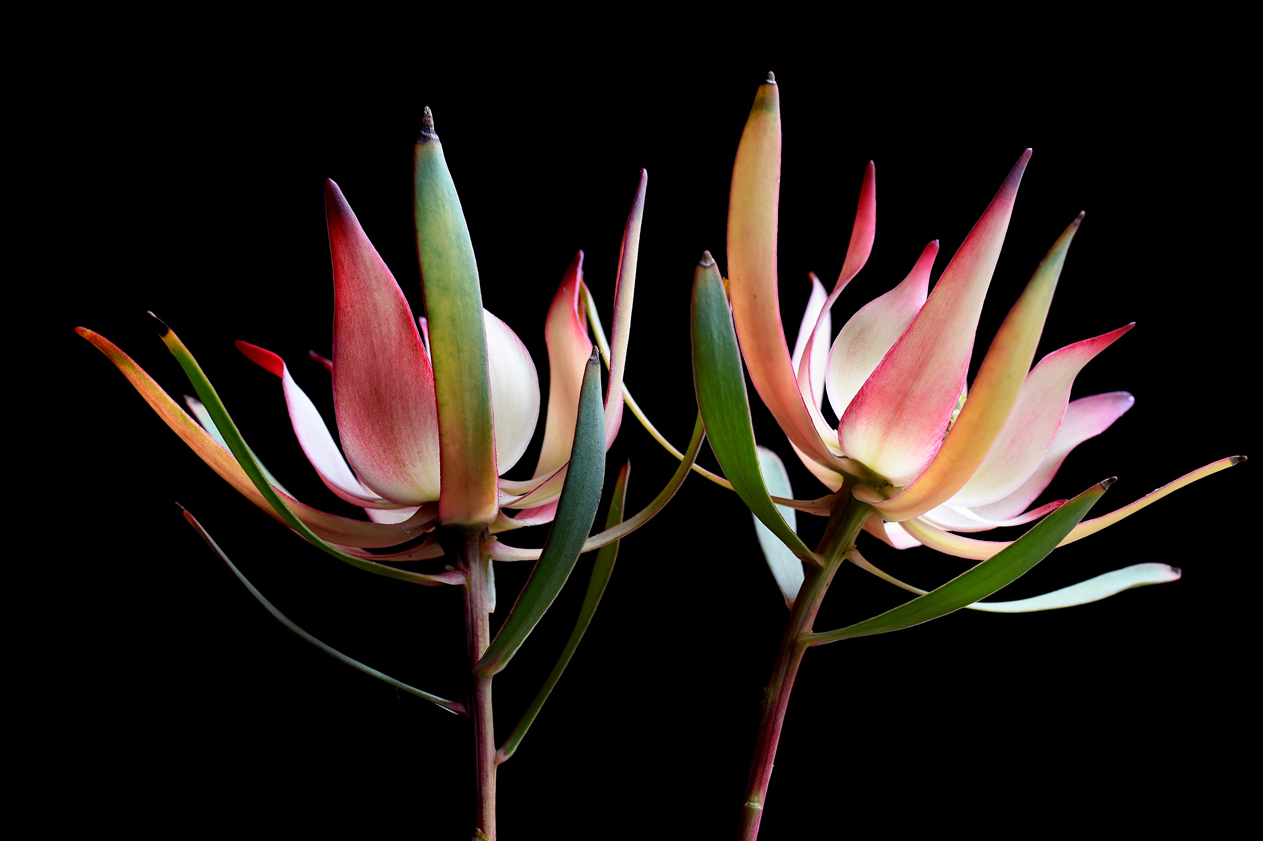 Structurally stunning Leucadendron flowers captured against a black background. Dramatic and beautiful, these wildflowers decorate the local landscape through Winter and into Spring.