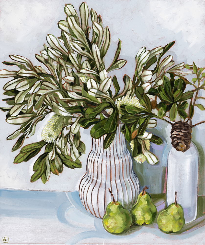 Banksia in white vases with pears
