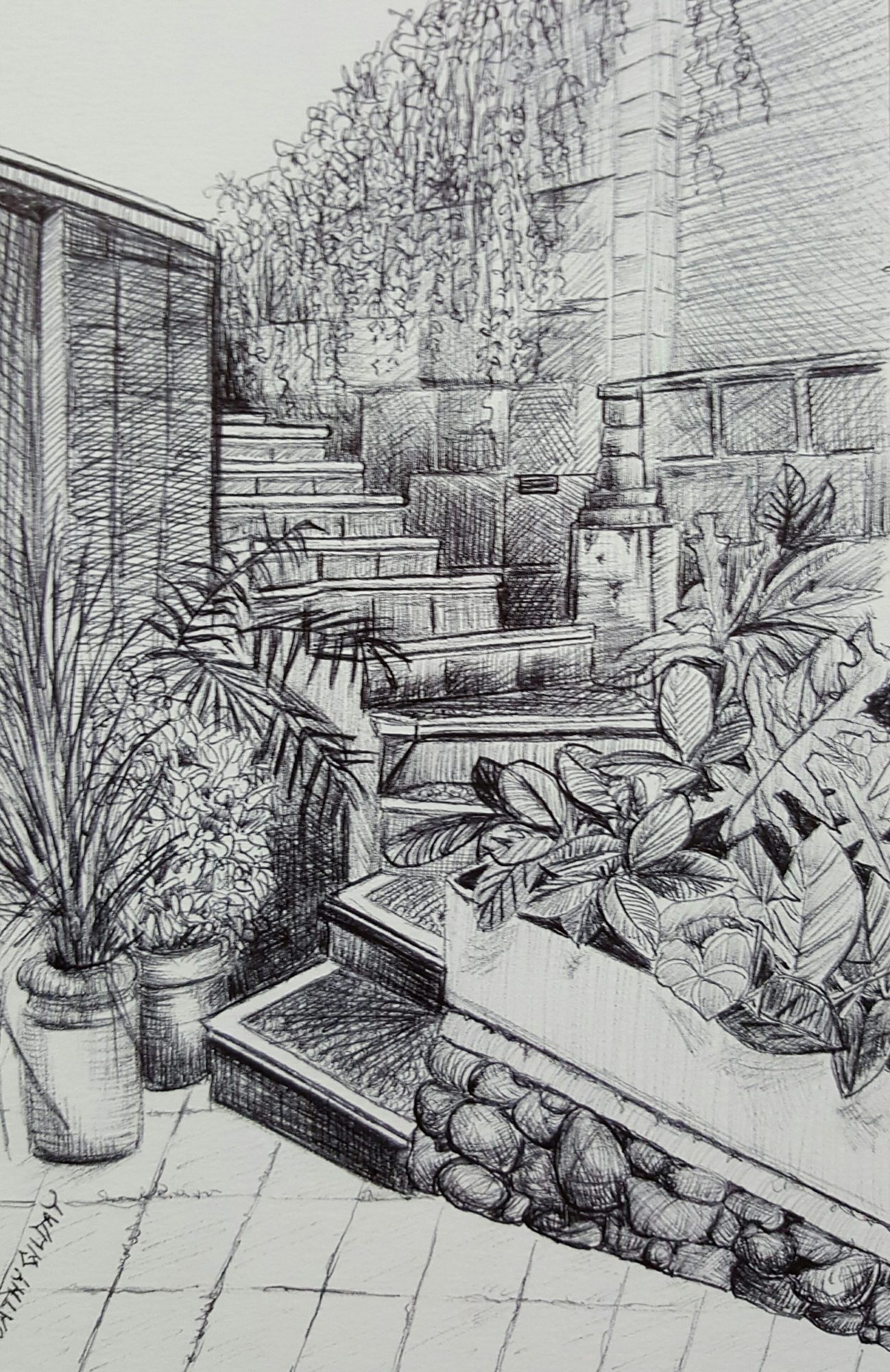 Ubud Stairway by Cathy Gilday – Inspired by a photo I had taken in Ubud, Bali earlier last year. The stairway stopped me dead in my tracks, begging to be photographed. Like pathways, stairways exude an element of intrigue and make an interesting reference. Ball point pen on artists acid free heavy paper, unframed.