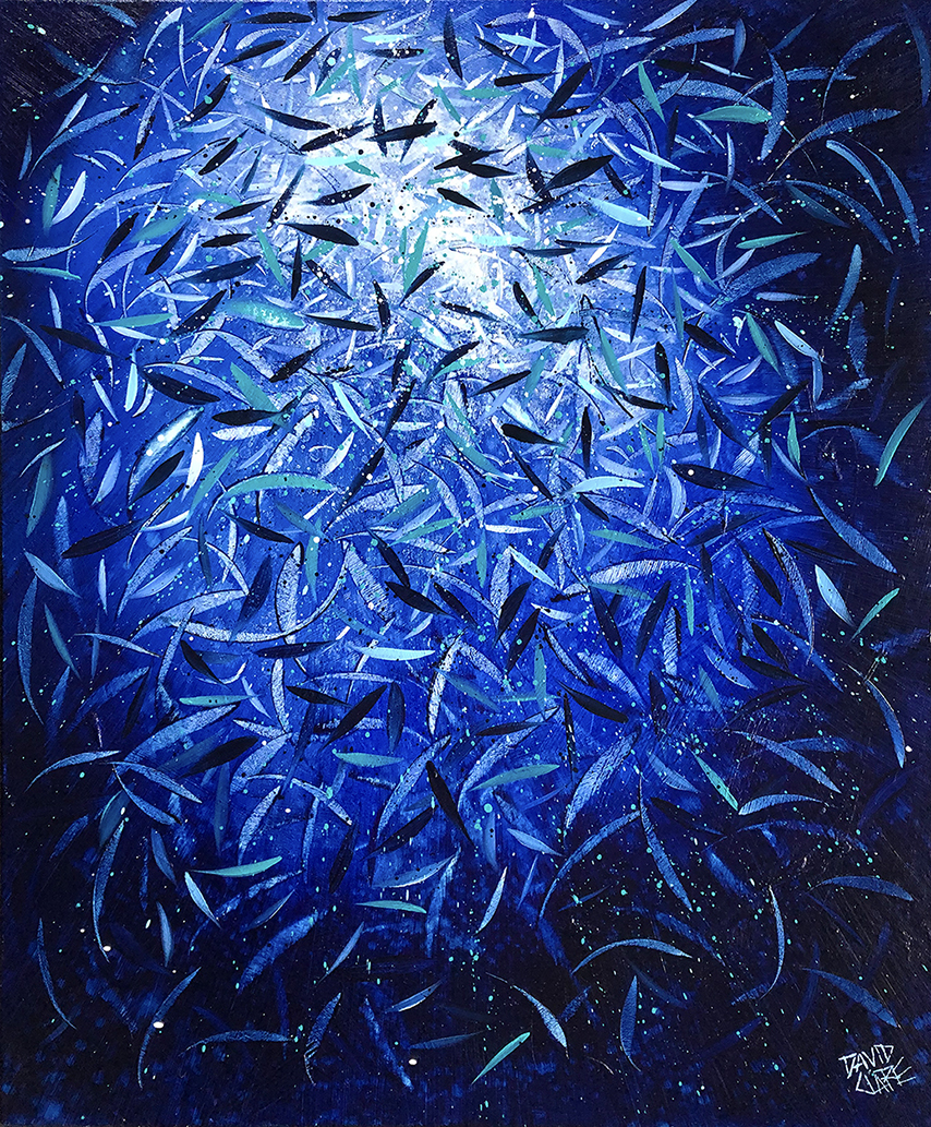 Ultramarine by David Clare – Original abstract oil painting of a school of fish. Underwater scenes featuring schools of fish have inspired me for many years. I love painting them, and this painting was hidden away and forgotten about until recently. Probably due to its small size, but also because most of my fish paintings are in cooler blues such as Phthalo and Prussian Blue, but this one was painted using Ultramarine Blue… hence the title. Now, you would think that Ultramarine would be perfect for ocean scenes, but I find it too warm, so this was probably an experiment… but, it still works, and upon finding it, I was pleasantly surprised. So thought I would release it to the world.