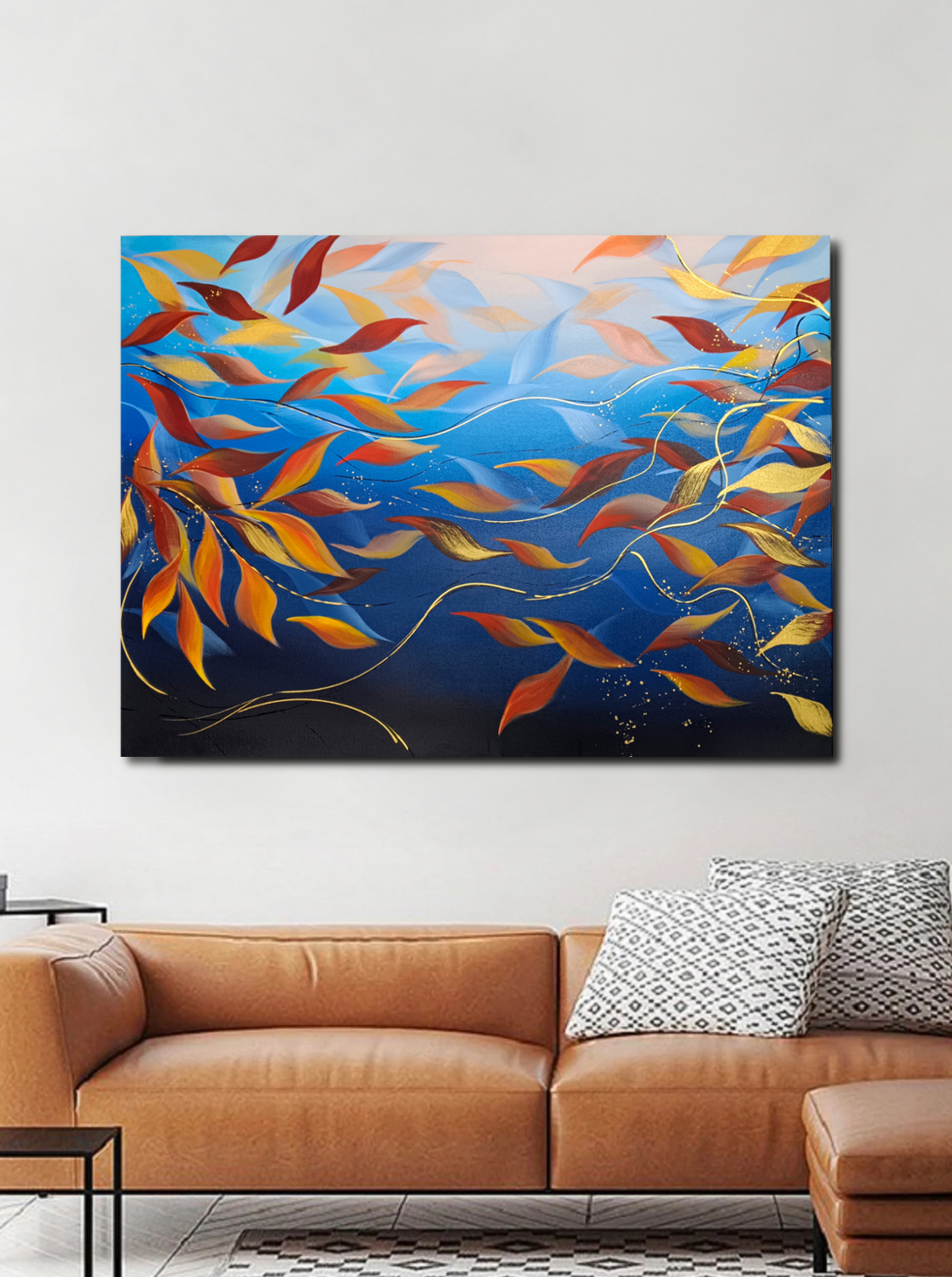 Original painting – a colour infused, eye-catching abstract acrylic painting stretched and ready to hang. This artwork has been finished with layers of professional grade varnish for extra protection and colour enhancement. It has a strong wire at the back.
