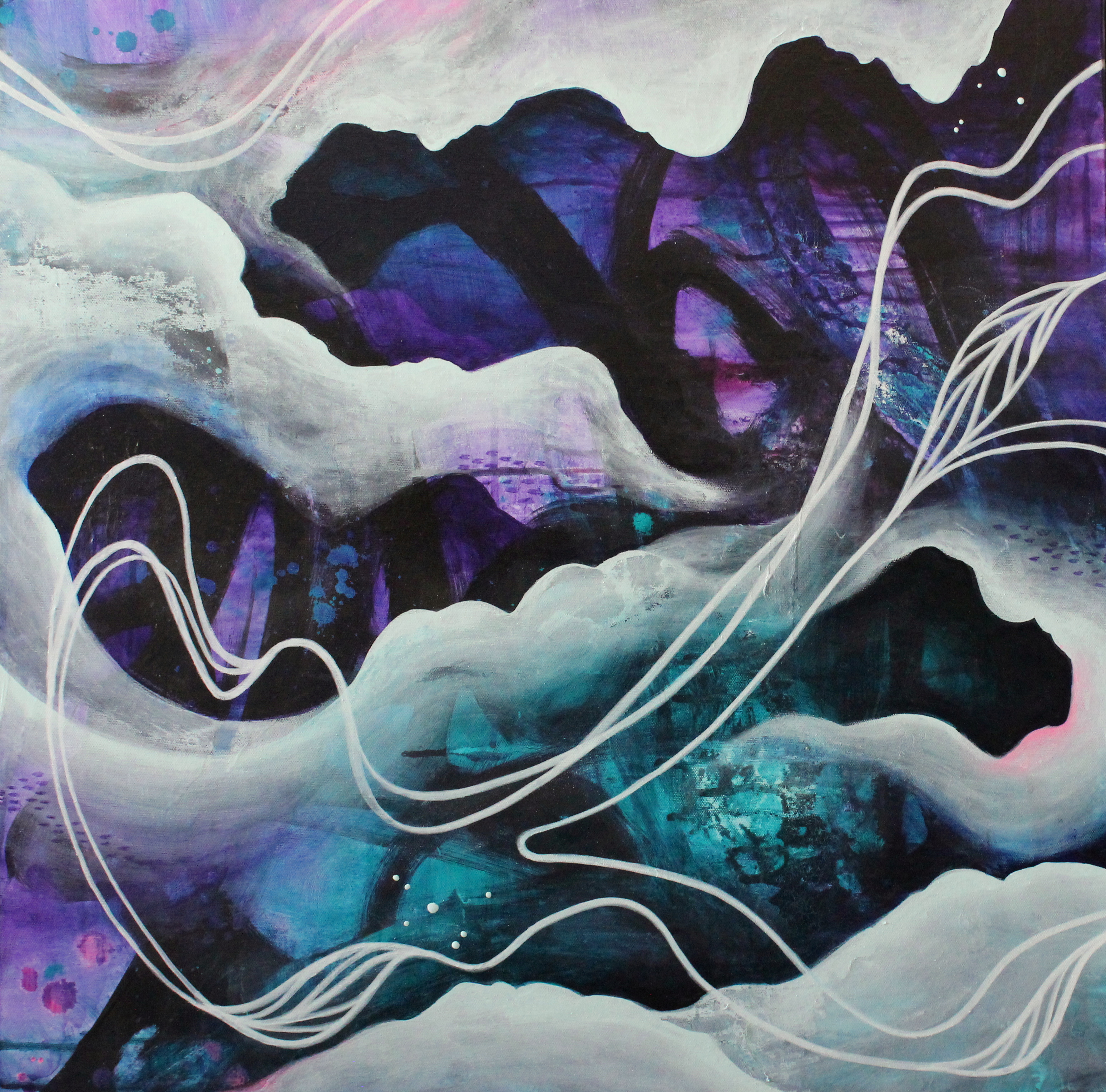 Unclouding is part of a series of works exploring the complex thoughts and feelings associated with evaluating one’s life path. The cloud like forms and lines, similar to those showing barometric pressure, represent changes in thought and direction. This dreamlike composition creates the impression that the winds of change are blowing through, gently moving the skeletal leaves across the canvas.