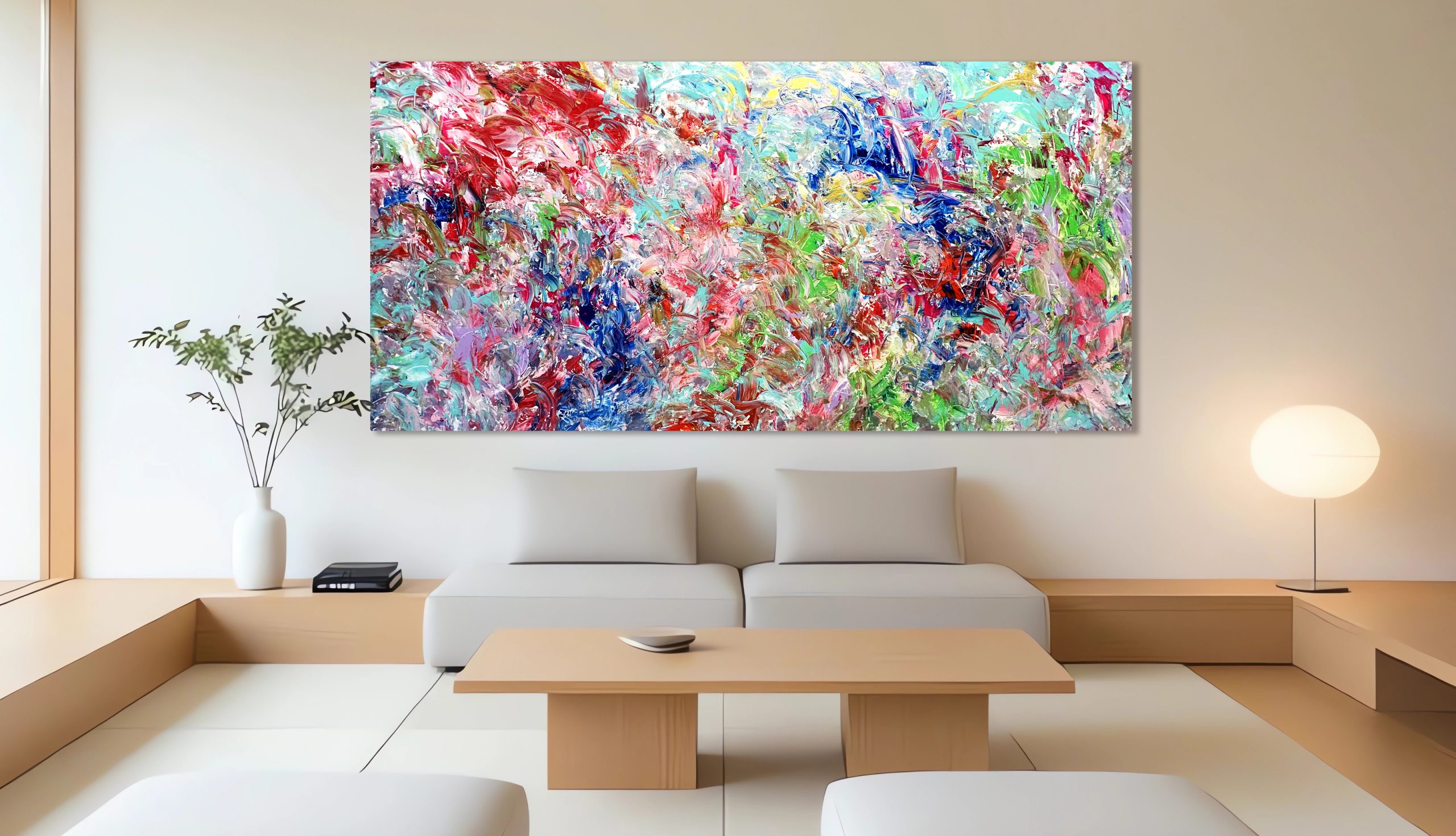 This artwork is painted on professional-grade canvas stretched and sealed with varnish. The canvas has dimensions of 198 cm in width by 96 cm in height. The painting wraps around the sides of the stretcher, so the sides are painted in the same style as the surface. As such, it does not need a frame.