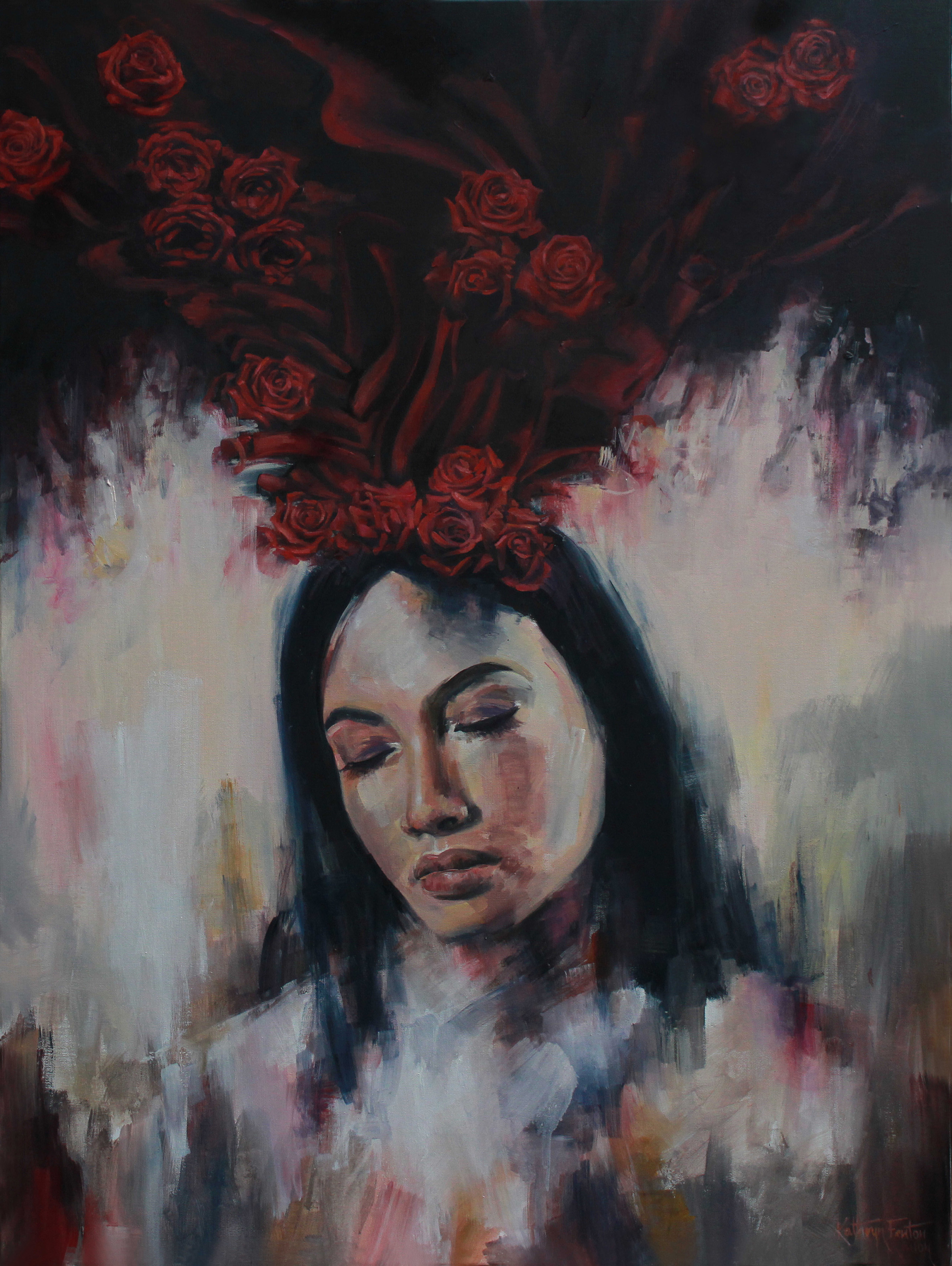 A symbolic cloak and mantle enveloping her adorned in the beauty and heady scent of blood red blooms.