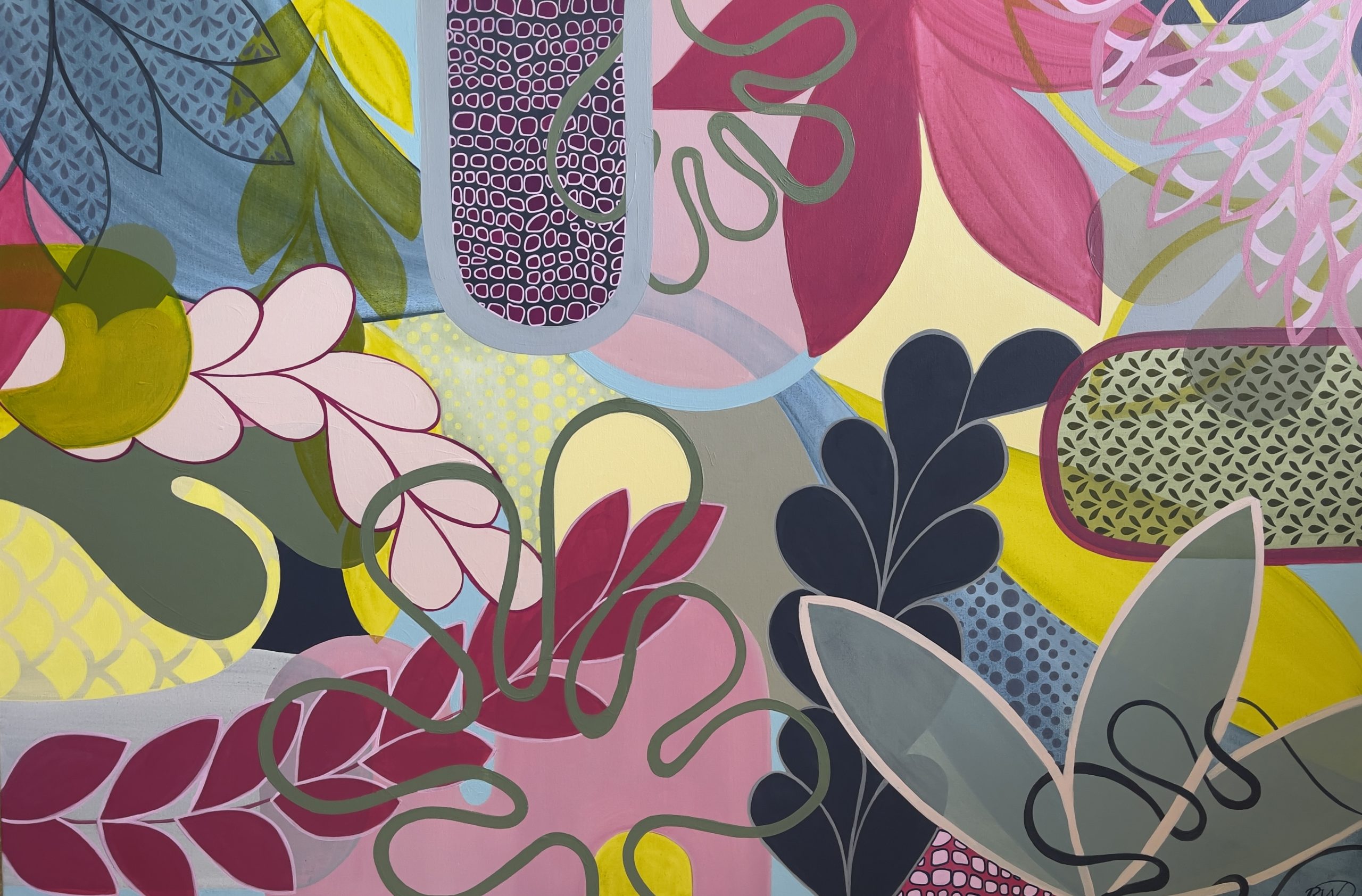 This large colourful artwork was inspired by nature and organic shape. It was produced through the layering of transparent and opaque hues. The vibrancy of colour adds to the aesthetic appeal in the work and communicates a feeling of joy. A sense of direction has been achieved with the addition of diagonal navy and yellow lines traveling across the work in a wave like motion. This large scale artwork would suit any contemporary home adding a pop of joyful colour into your space.