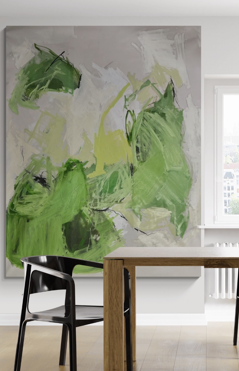 This painting reflects the felt experience of being held within the natural world — not as landscape, but as presence. Layers of green and softened gesture evoke the sensation of standing beneath sheltering growth, where light filters slowly and awareness deepens.