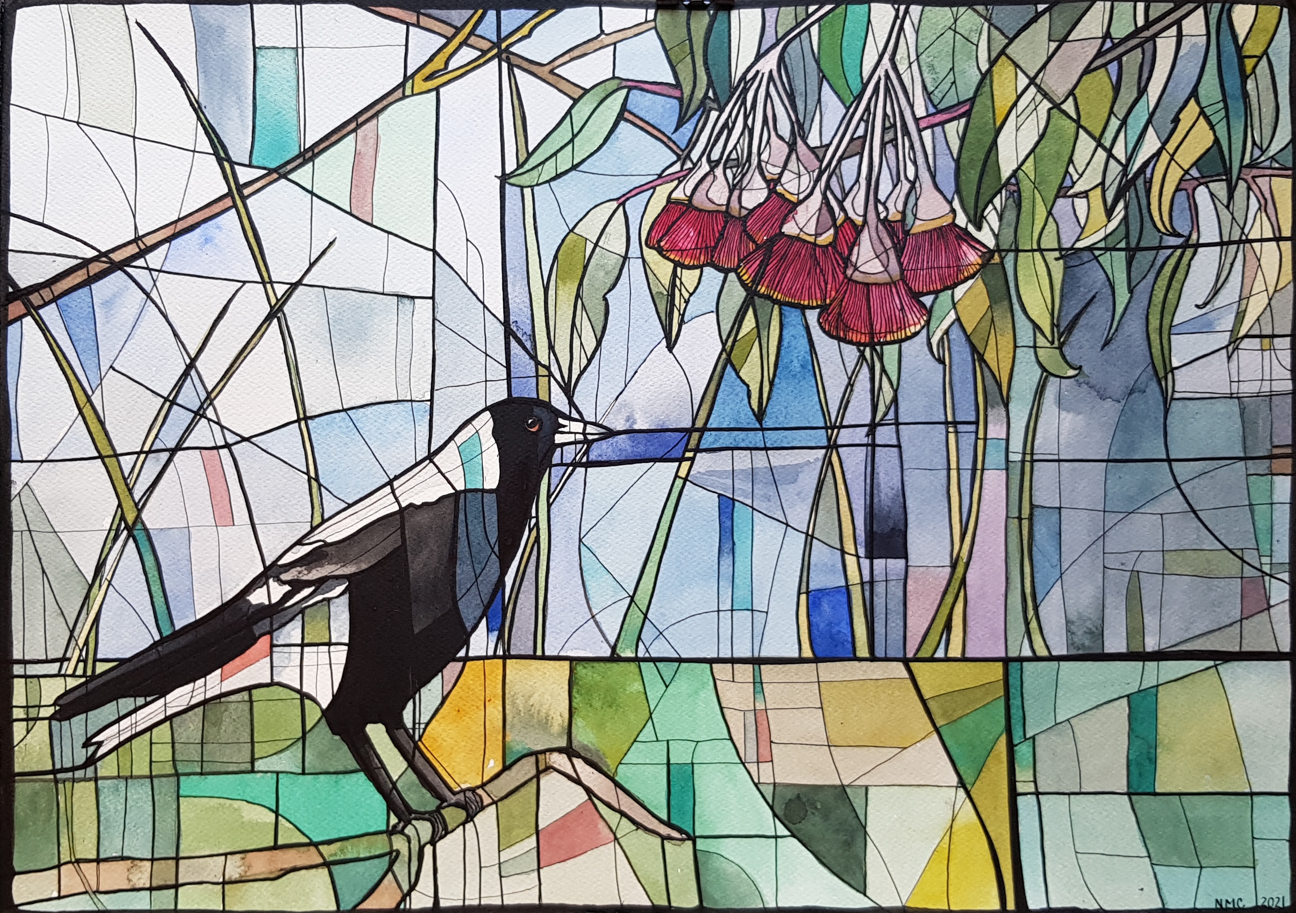 Under the Gum Tree by Nicola Cowie –Â Depicting the clever magpie in a stylized landscape of grasses and the beautiful flowers of the Silver Princess gum tree. It is painted in washes and layers of beautiful watercolour and held together with a web of pen and ink linework and a heavy border akin to stained glass.
