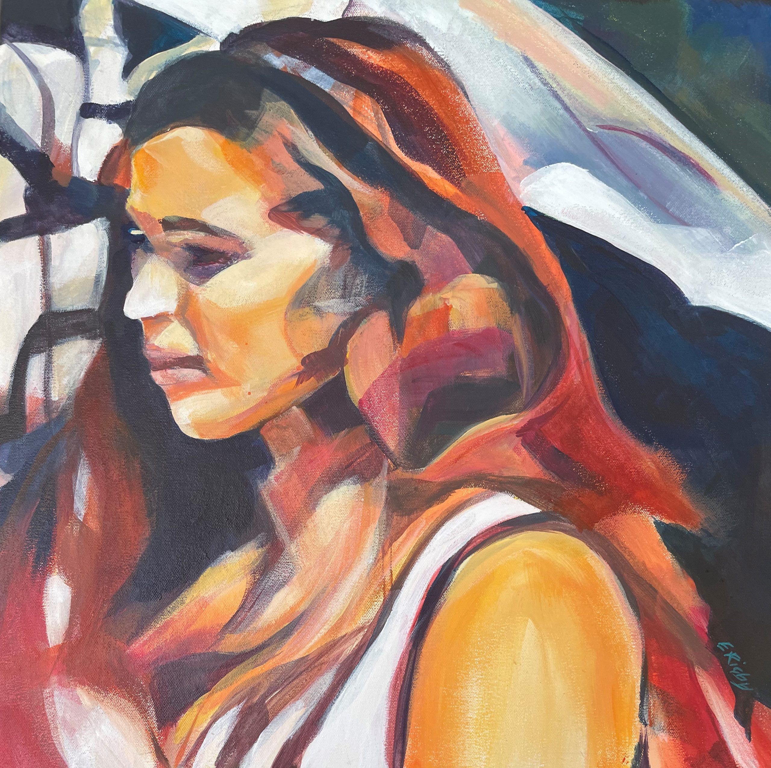 Under the Roman Sun by Eileen Rigby – This painting is one of a series of women from all stages and walks of life. I continually observe life and capture moments that tell a story and typify everyday scenes. Being alone does not necessarily equate to misery or sadness but that a crowd contains individuals each with their own story to tell and my paintings give each individual their own platform. ‘Under the Parasol’ showcases a woman, though accompanied was, very much, in the spotlight. It was a hot day and everyone I saw seemed dishevelled and uncomfortable but not her.