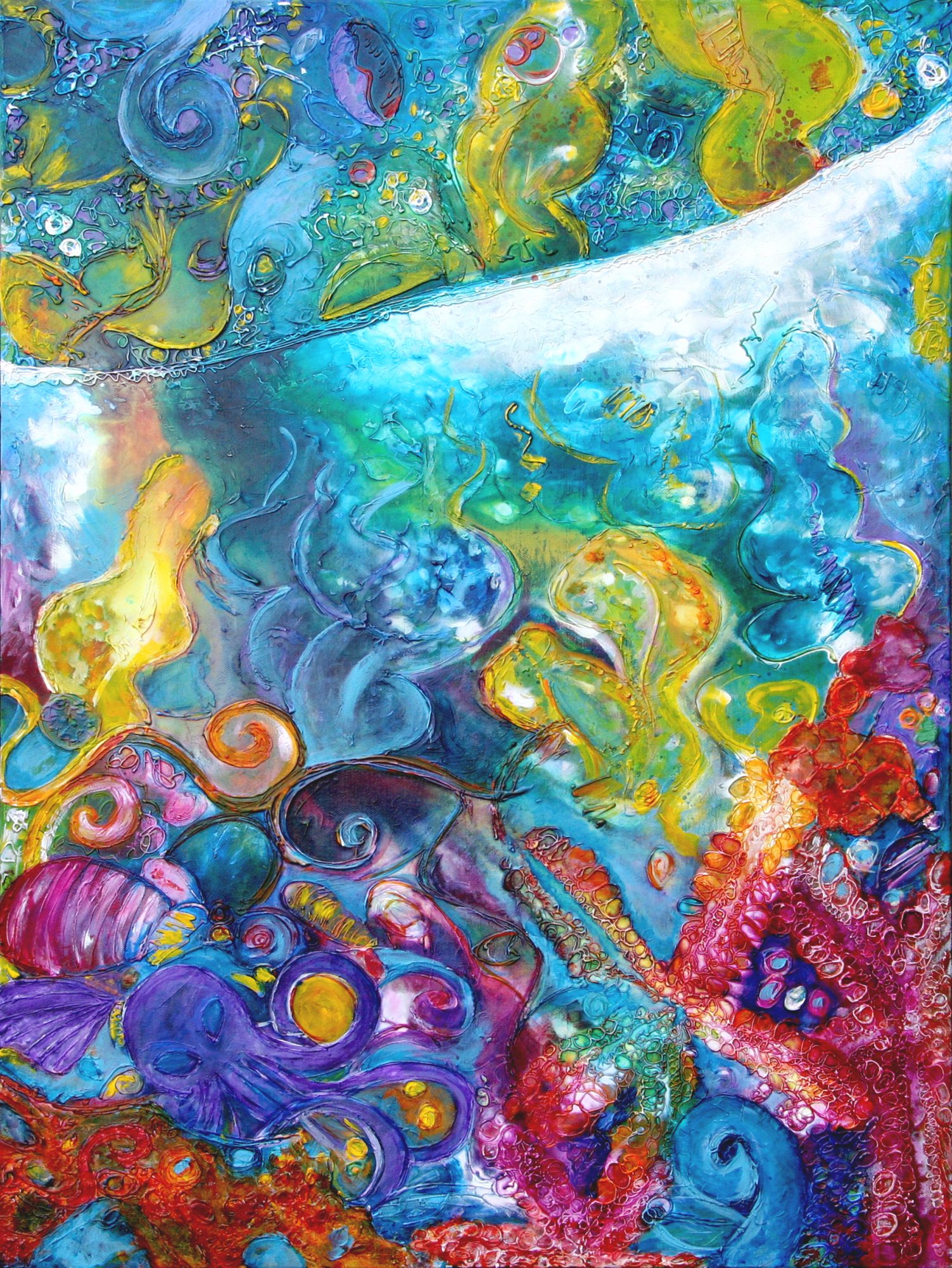 This brightly coloured painting is how vivid those colours look underwater when you snorkelling, with all kids of sea life hidden in this abstract artwork.
