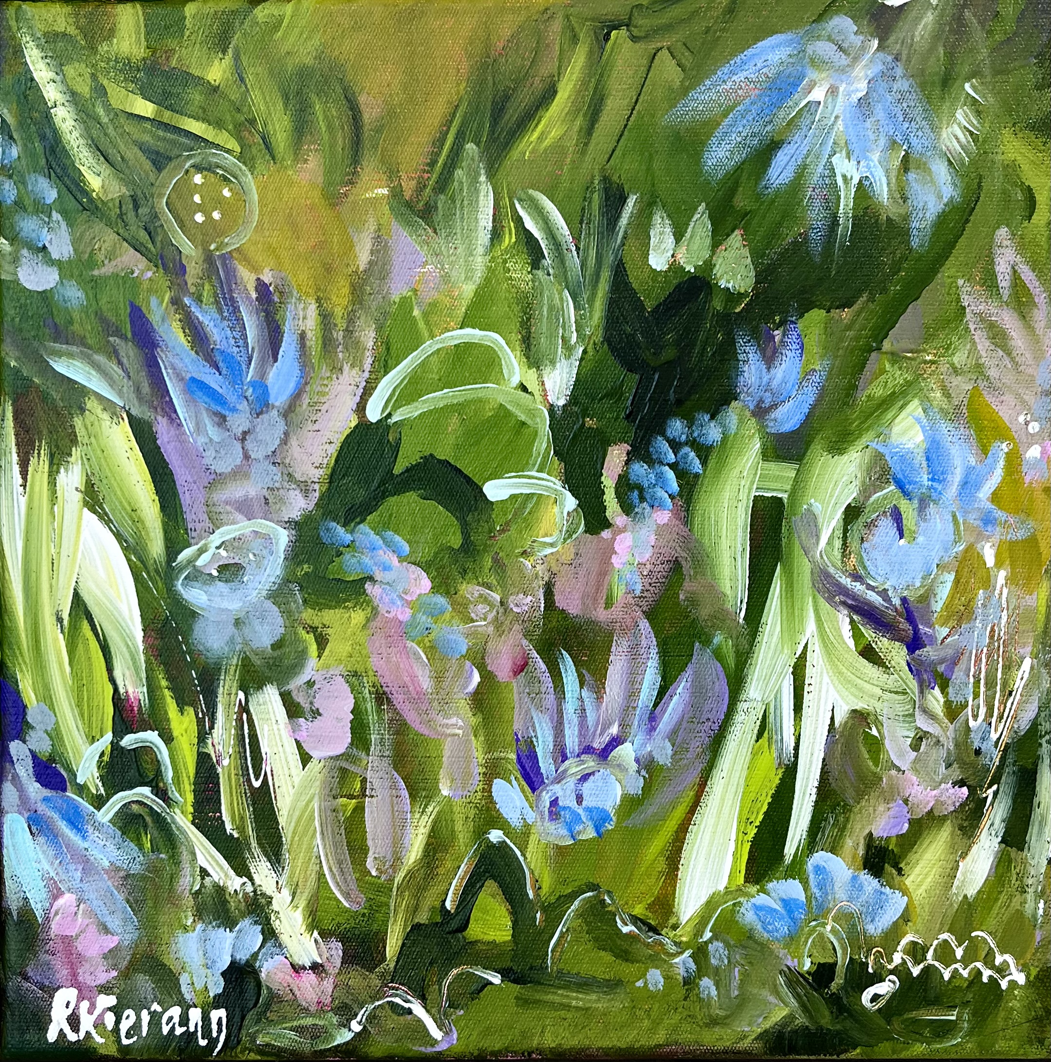 Underneath the Canopy immerses the viewer in a lush, vibrant natural scene. The dominant colour is green, reflecting dense foliage, with various shades blending together to form an intricate, layered background. Pops of blue, purple, and white suggest flowers, leaves, or other natural elements peeking through the greenery. The brushstrokes are expressive and fluid, creating movement and energy throughout the composition. Organic forms swirl across the canvas, mimicking the feeling of life thriving beneath a canopy of trees. The soft, ethereal quality of the flowers contrasts with the bolder, more textured greens, offering a sense of depth and mystery.