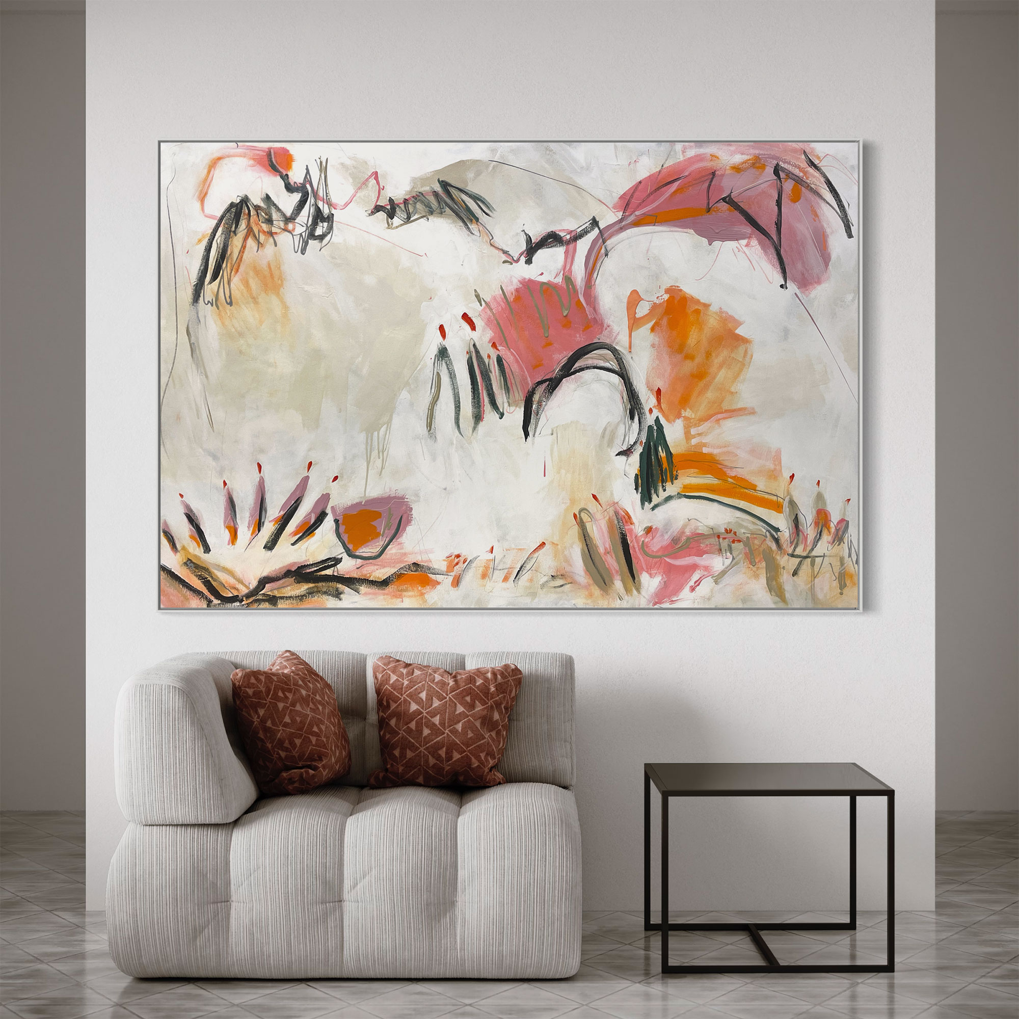 It’s intriguing mark making and texture combined with its beautifully balanced palette of apricot, orange, blush, pink, sage, green, black, grey mixed with white, beige and neutral tones.