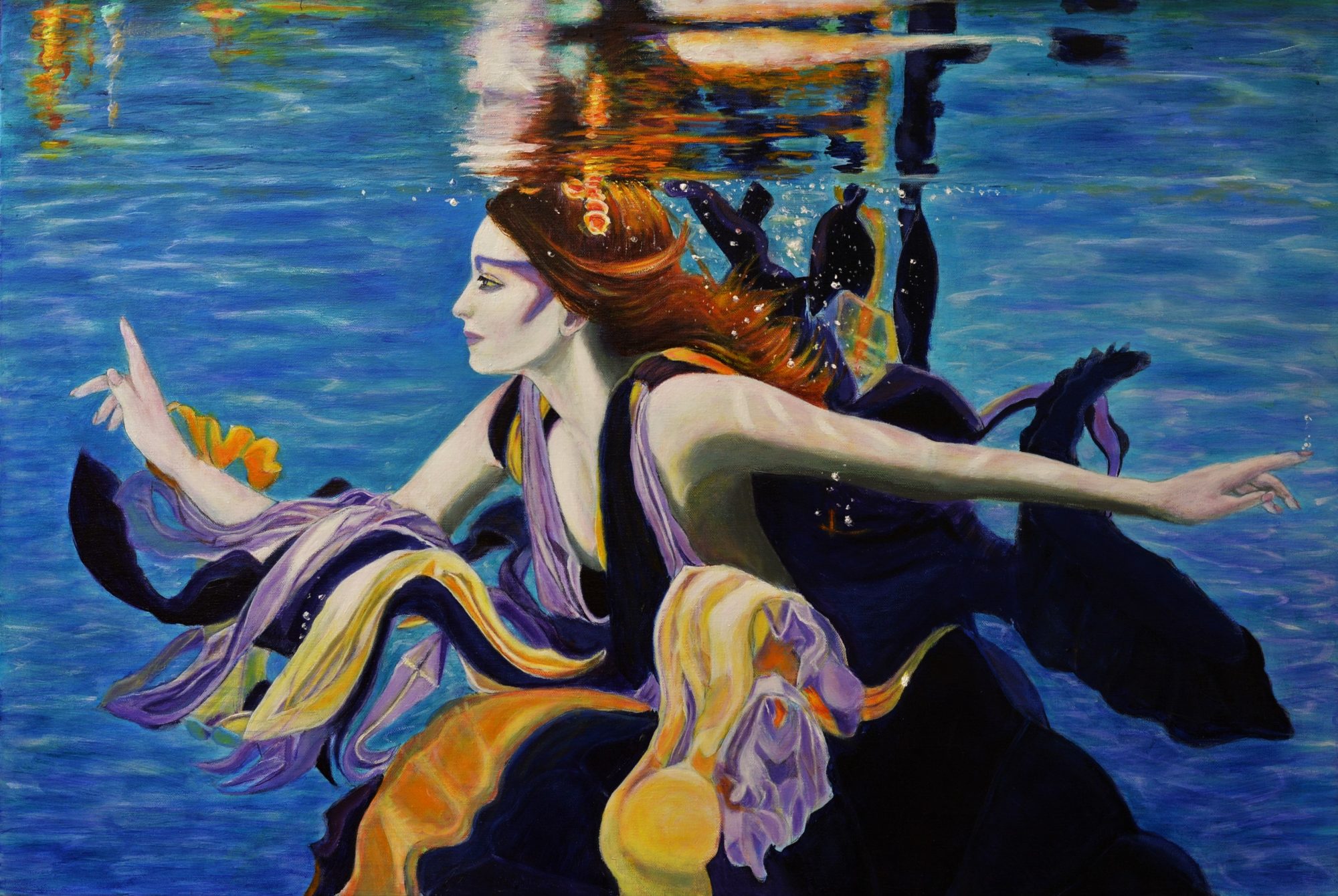 There is an other-worldly tranquility when submerged in water. In my Lady of the Lake painting the colourful, flowing gown creates a sublime image that I constantly find peaceful and pleasurable to view.