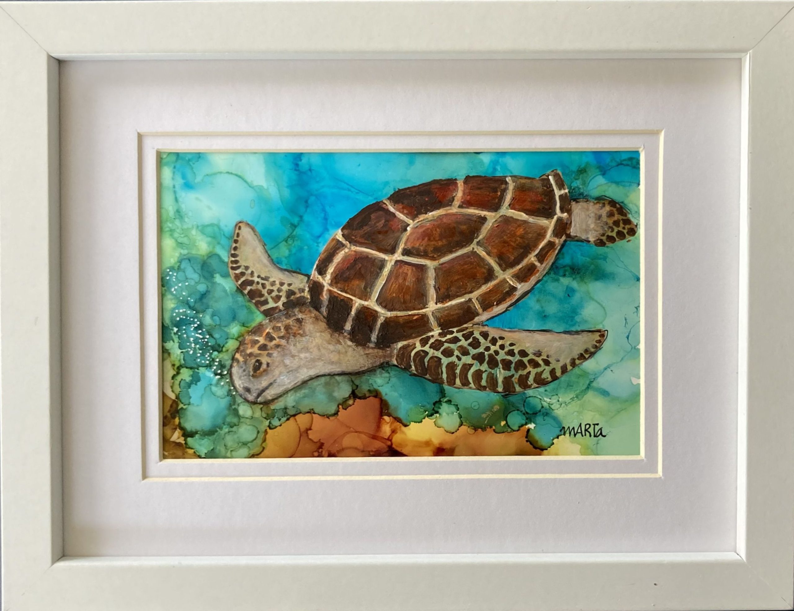 ‘Underwater Grace’ is a contemporary small painting of a sea turtle gliding peacefully through underwater hues of blues. This original artwork was created using alcohol inks on yupo paper, giving the piece its rich, fluid texture and sense of movement. The turtle invites the viewer into a moment of quiet connection with marine life.