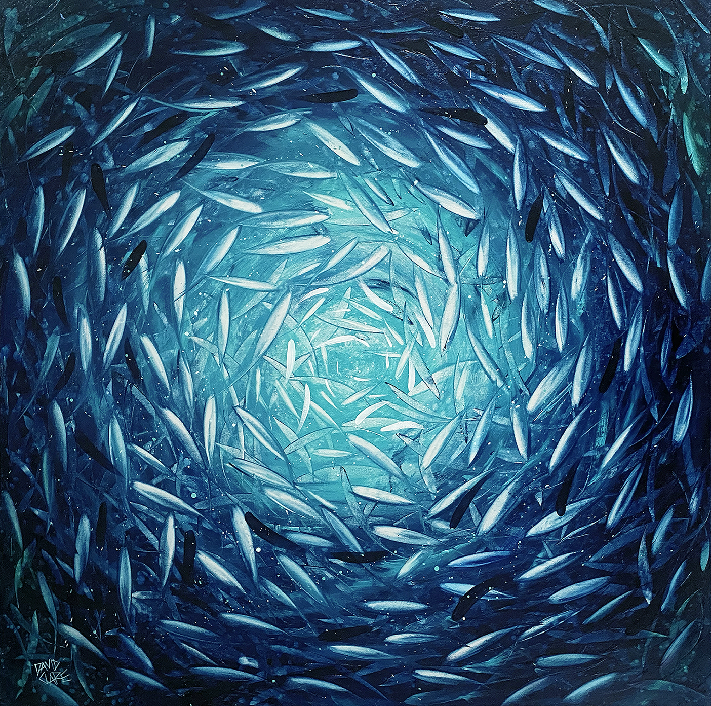 I am endlessly inspired by the ocean and in particular, schools of fish. This scene is viewed from the depths under the fish looking towards the light shimmering through the fish.