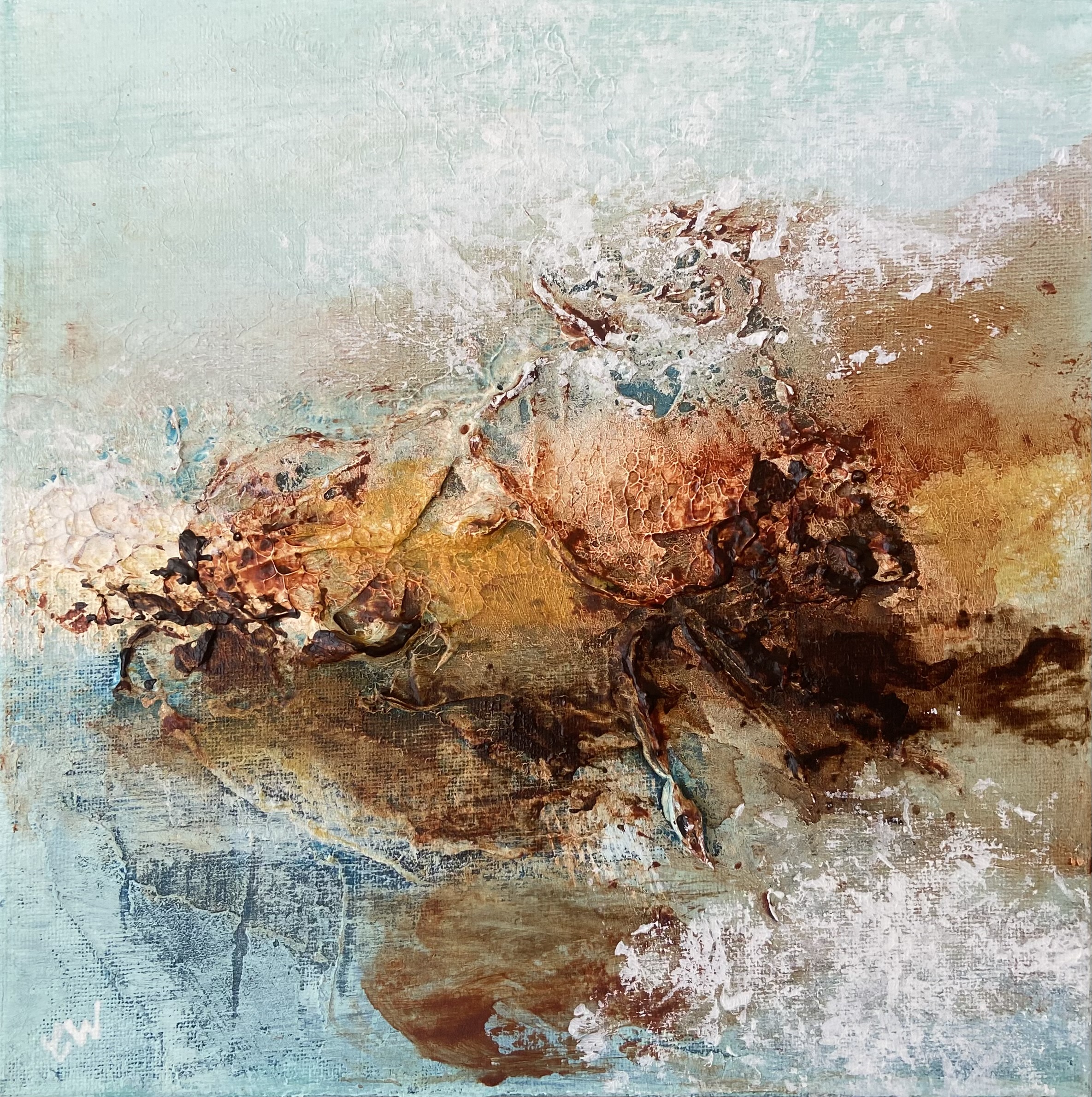 Unearthed by Carrie Welsh is a beautifully textured abstract landscape. Â 25 x 25 cm. Acrylic on canvas, ready to hang. Frame not included.