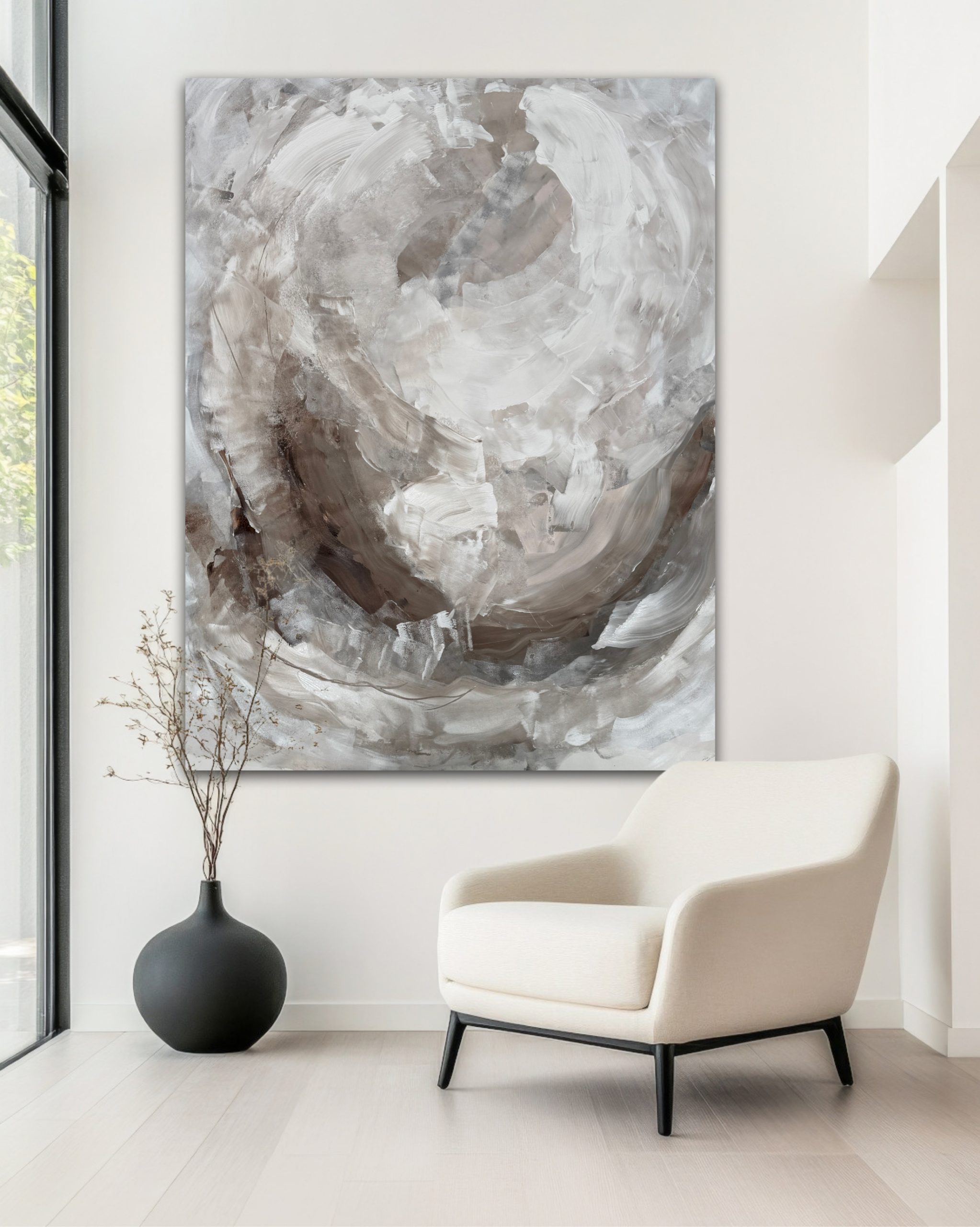 ‘Unspoken’ is a large scale abstract piece that explores the raw beauty of natural textures and tones. With fluid, textured brushstrokes and a soothing palette of warm browns, soft greys and creamy whites, this artwork evokes the feeling of calmness and serenity.