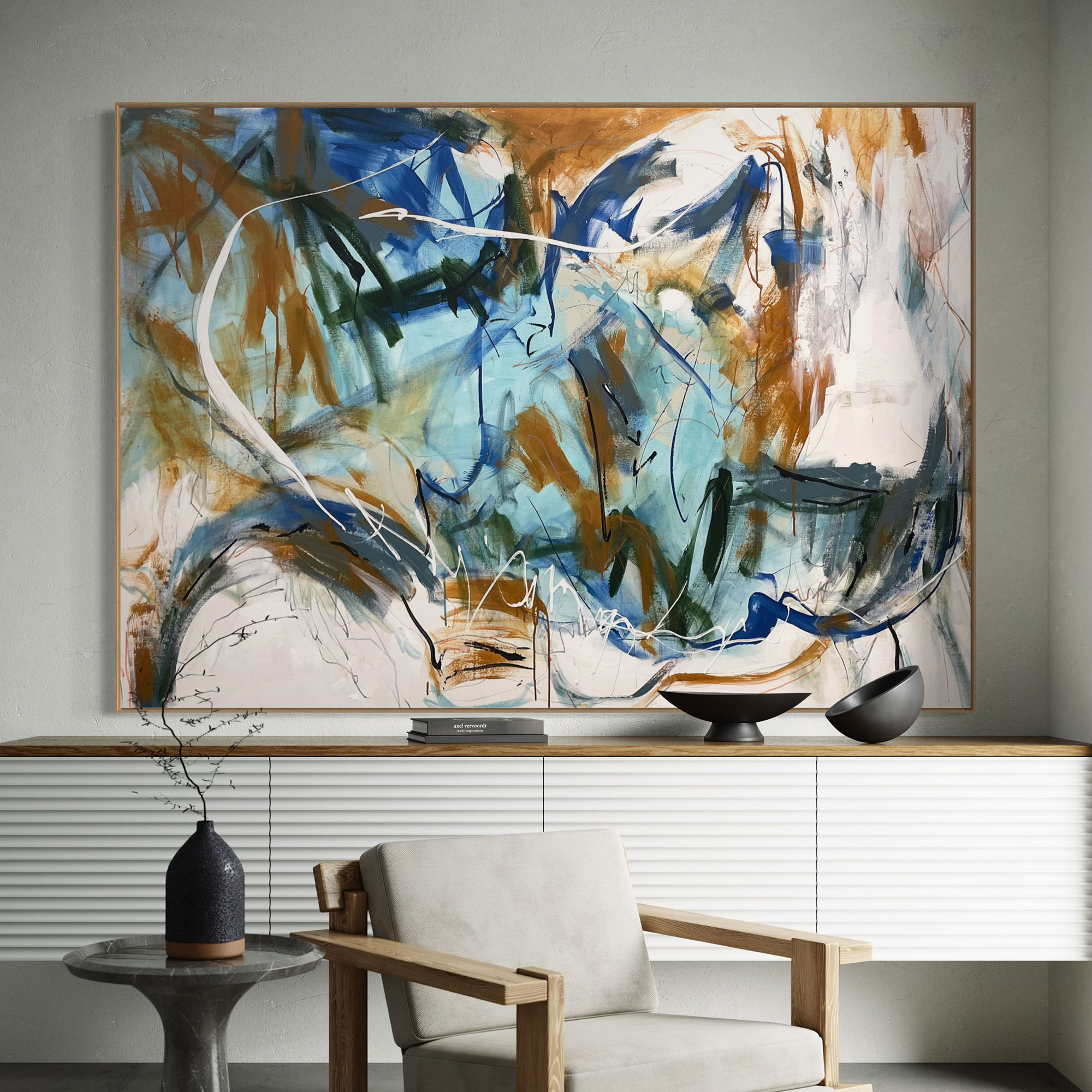 This striking statement piece combines complex mark making and texture with a beautifully balanced palette of ochre, orange, mocha, beige, and white with cool grey, black and greens blended with a combination of graduated blue hues found in the landscape.
