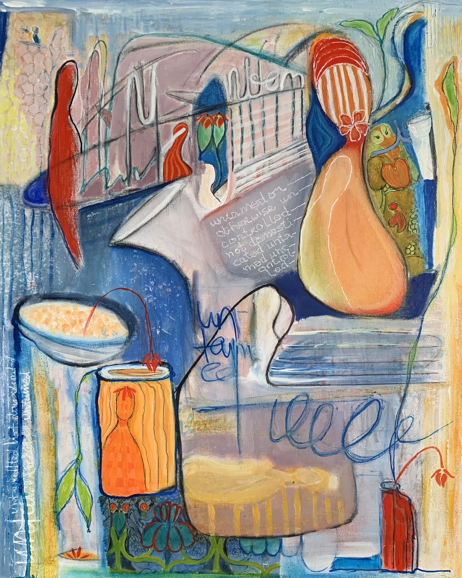 This painting is consumed by these thoughts and has a cheeky surrealistic humorous tinge to the more serious underlaying concept and Marijke hopes the viewer will wonder and ponder with her besides giving a wonderful splash of color on the collectors wall.