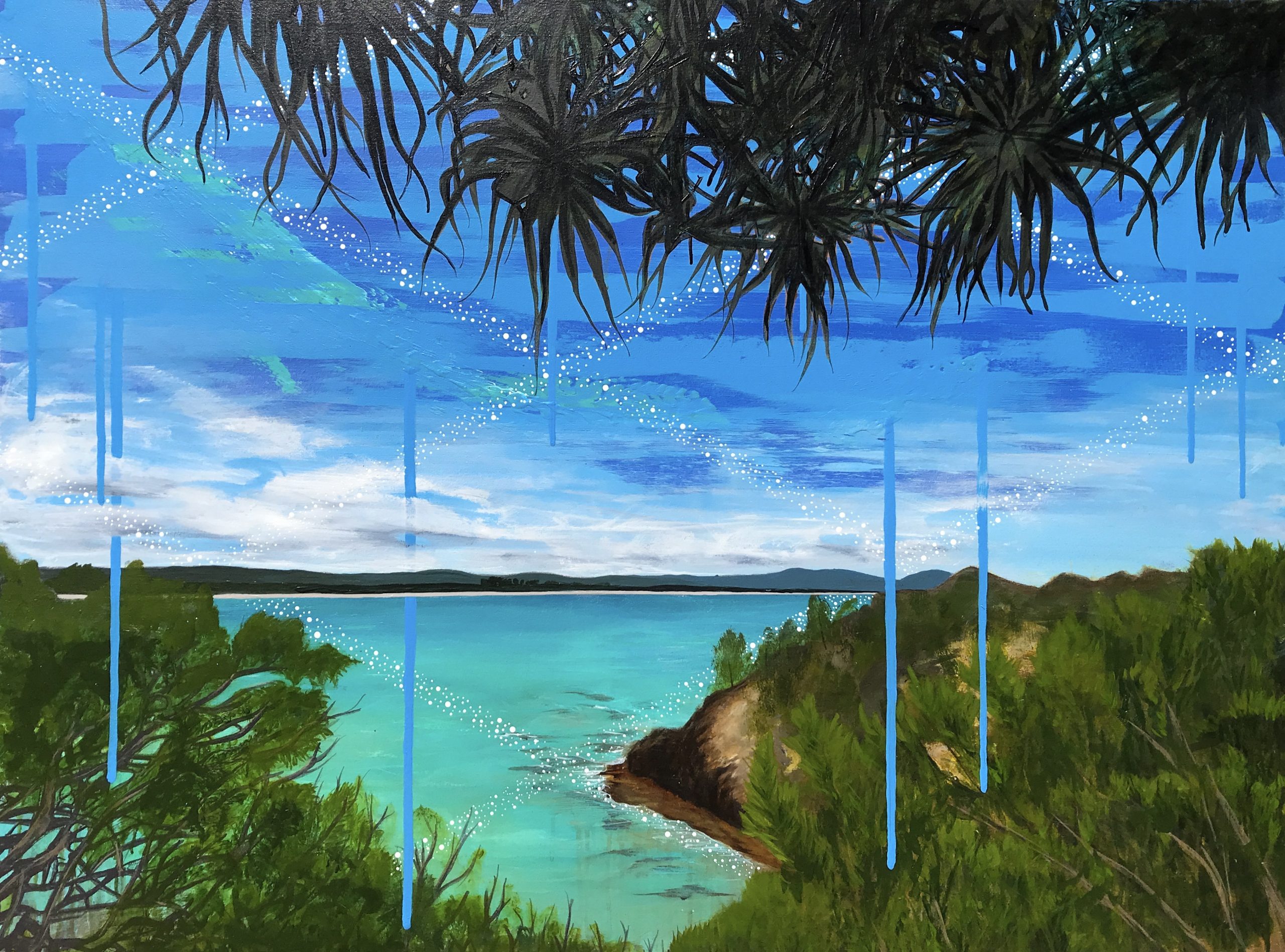 Untitled (6) by Anthony J. Walker – features a unique view looking North from The Pass in Byron Bay. This artwork is part of Anthony J. Walker’s Cavanbah series, sharing the First Nations artist’s personal impression of the Country he has lived on for the past thirty years: Arakwal Country, Bundjalung Nation.