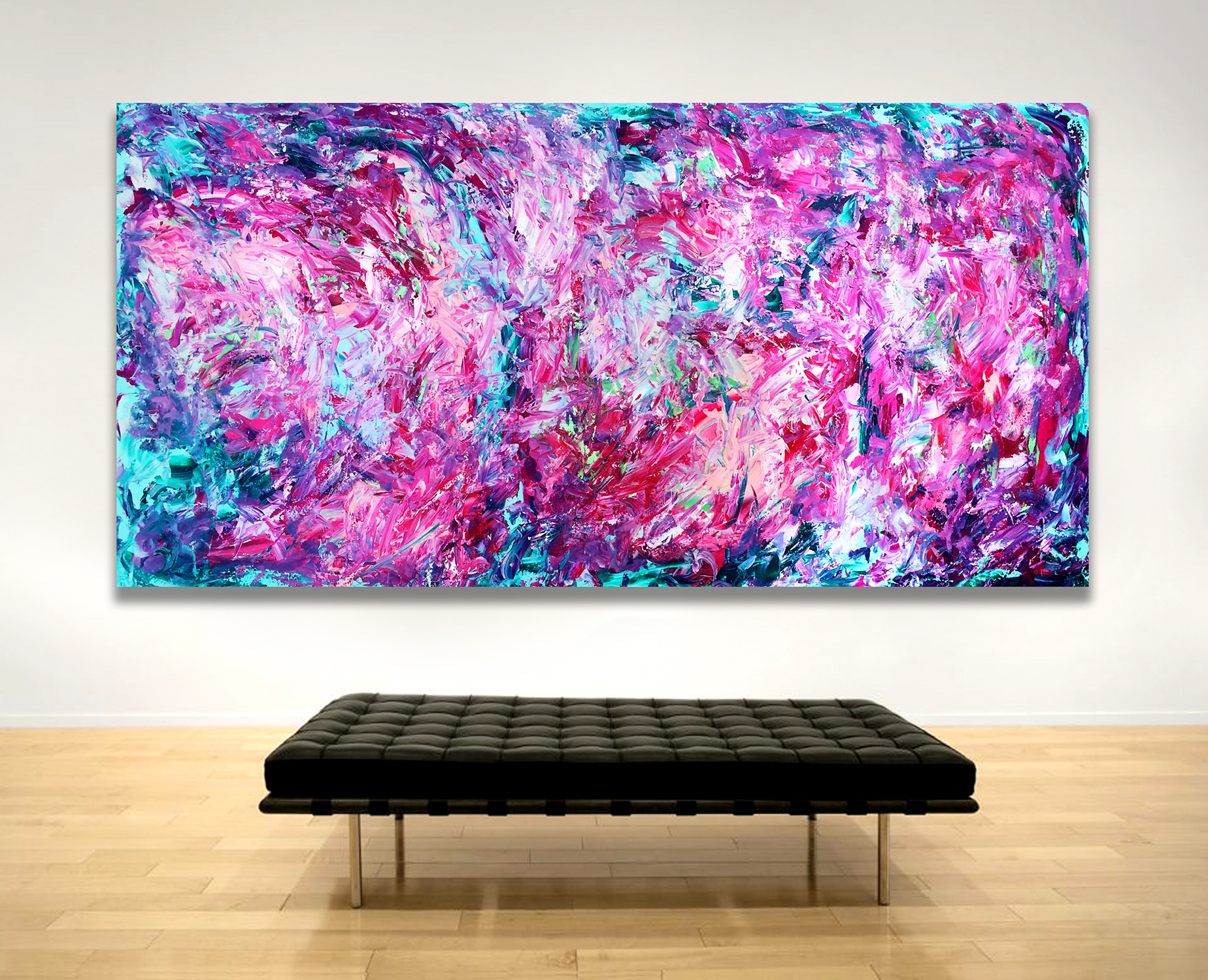 This work is painted on 12 oz gallery canvas and has been sealed with varnish. The canvas is hand-stretched onto a frame is 213 cm in width by 106 cm in height.