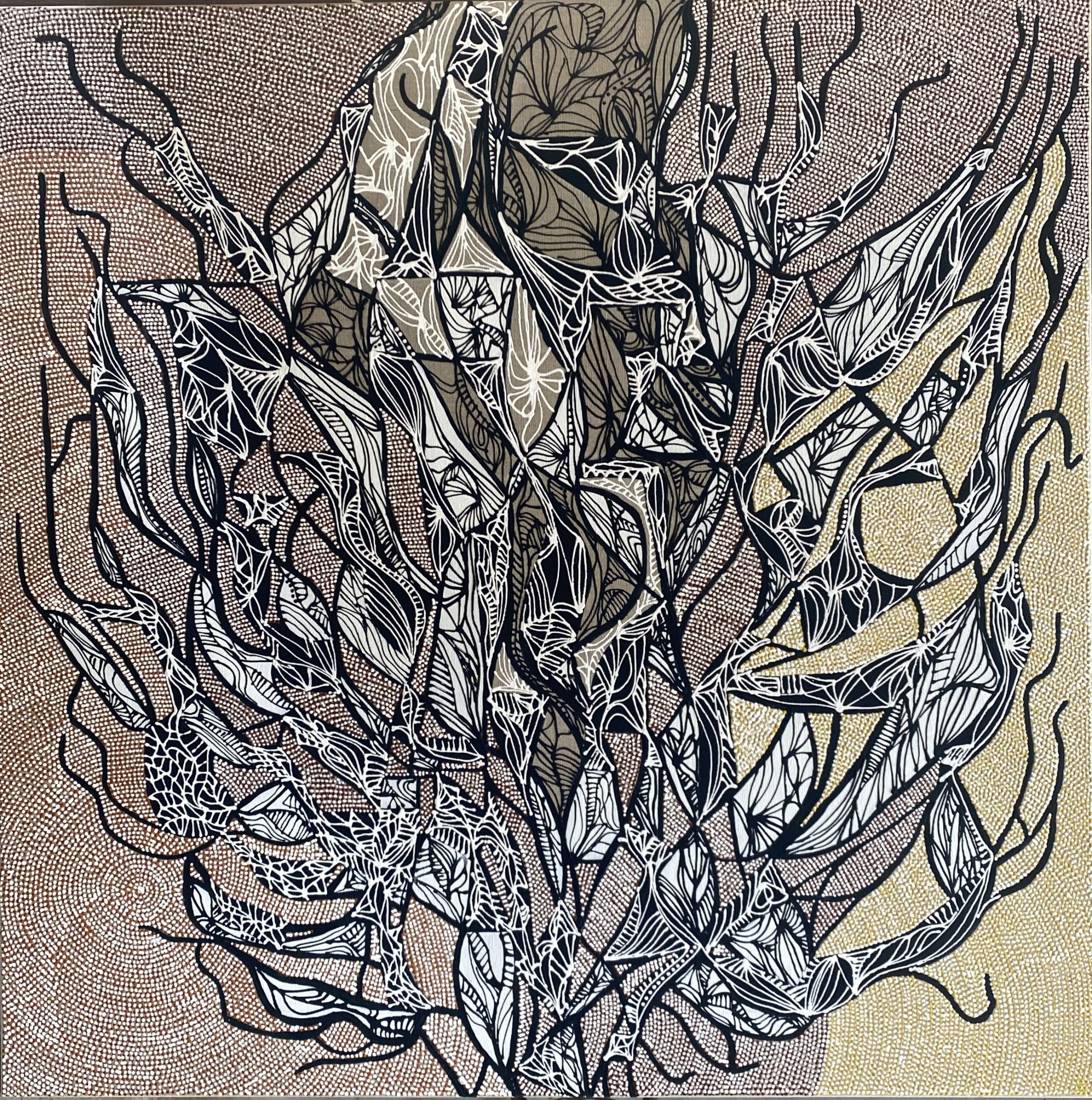 She was painted in Waran, on Country for me right in the heart of sydney. And she was painted from my intuition and feeling memory of the past coupled with the visual spectacle of our native flora reclaiming parts of the concrete jungle around Dawes Point.