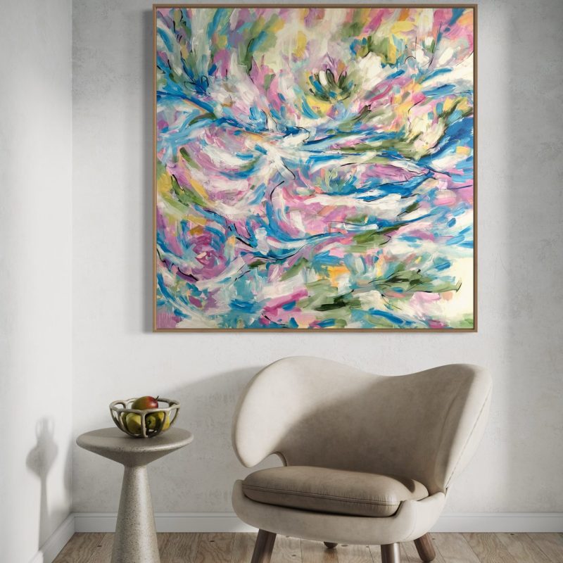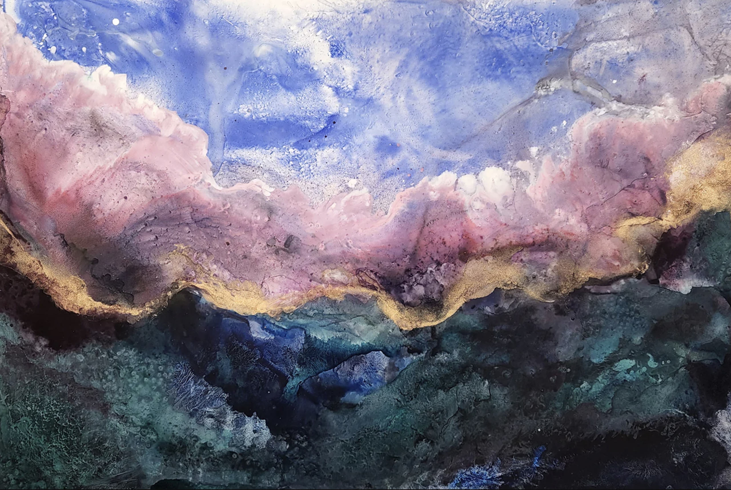 A mystical magical original on paper featuring jewel tones, emerald, navy blues, pink, sky blue and shimmering metallic gold. This piece is an abstract landscape, a dreamy interpretation of the rolling hills, bright blue skies, puffy white clouds, and the different flora and fauna near the beautiful bushland and mountainous area where I grew up.