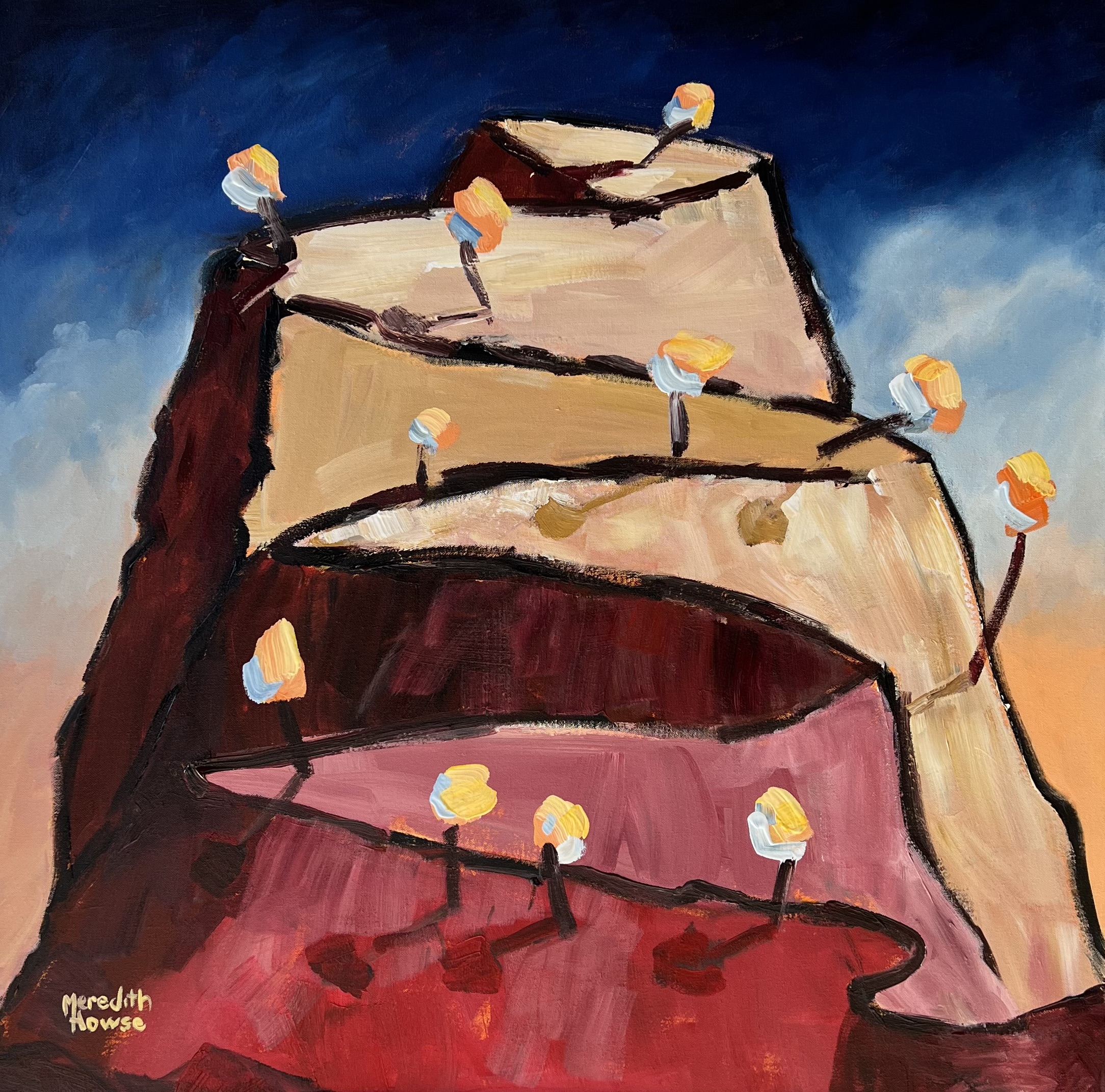 Up and Down by Meredith Howse is a captivating abstract painting on a textured canvas, presented in a square format. The canvas is alive with a vibrant palette, showcasing deep blues and reds, oranges, soft pinks, and radiant yellows. The overall composition is infused with energy and warmth, inviting viewers to explore its depths.